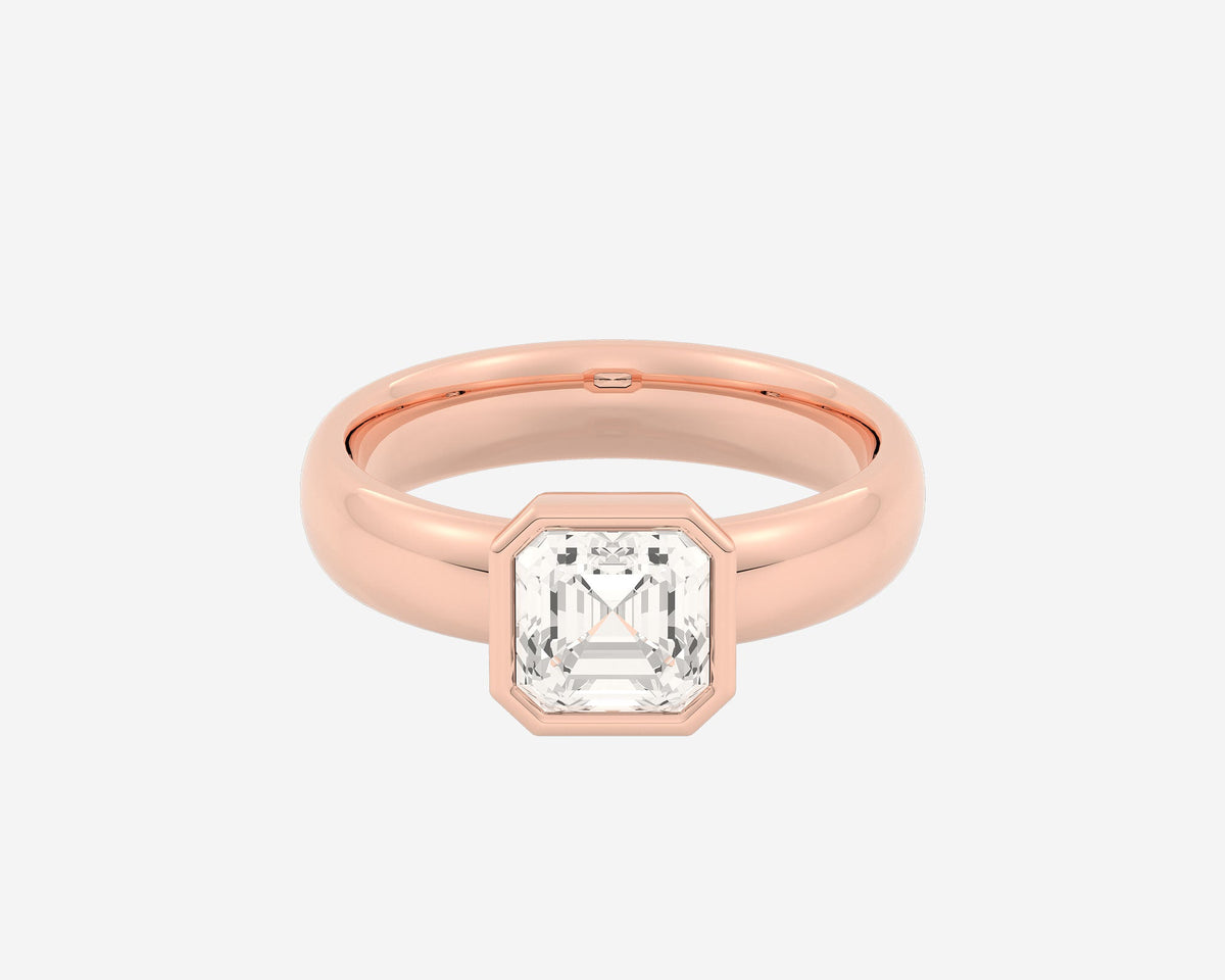 This Low Set Bezel Solitaire — Asscher ring by Holden offers a secure, low-profile bezel setting for a lab-grown Asscher-cut diamond on a comfort-fit band. Customizable in width, metal, and finish, this ring harmonizes modern security with classic elegance, making it a timeless choice for an engagement ring that is as practical as it is beautiful.