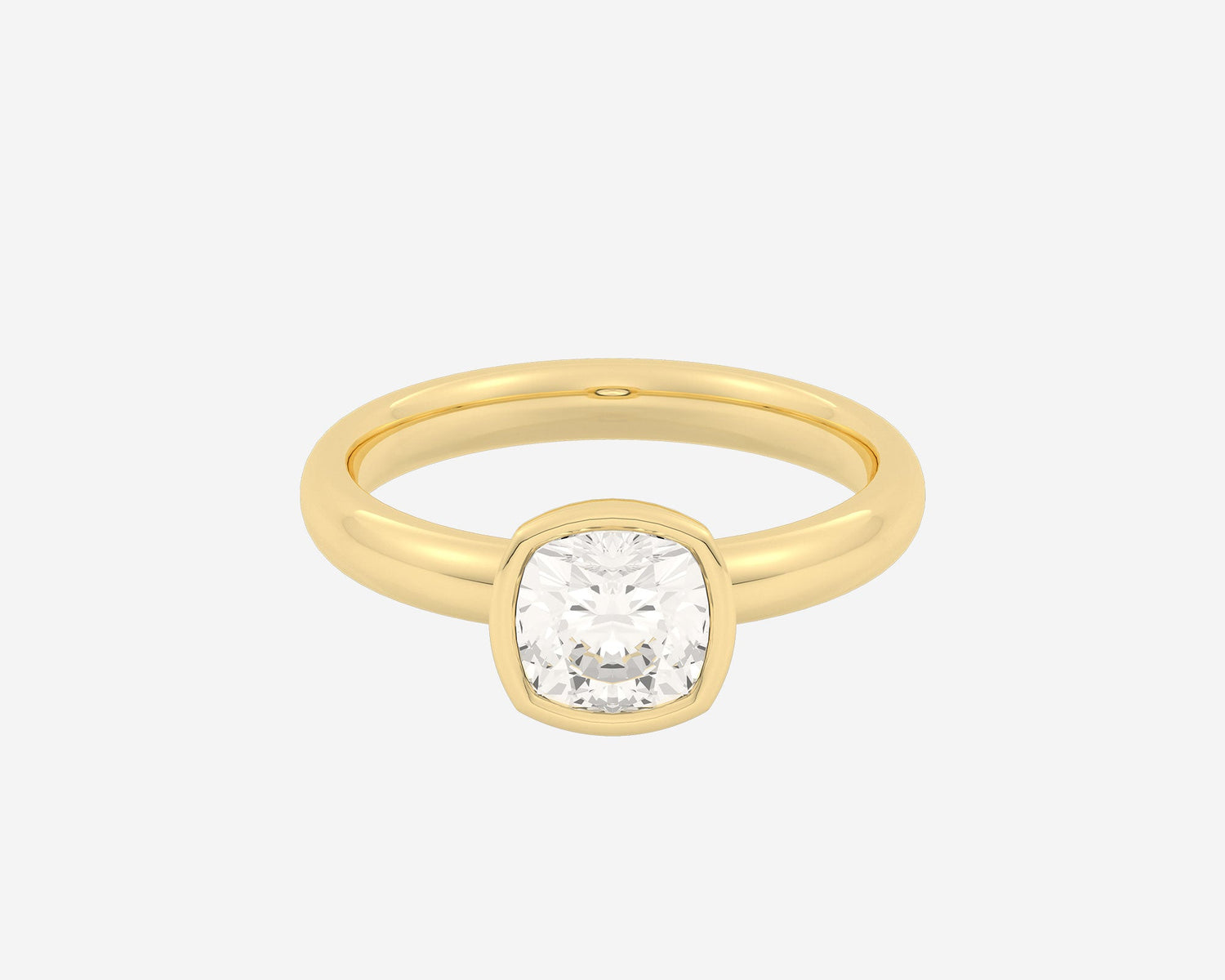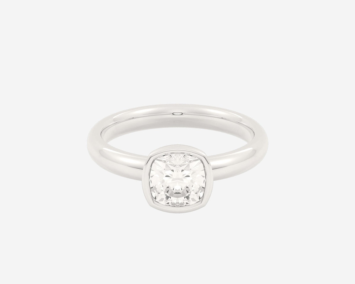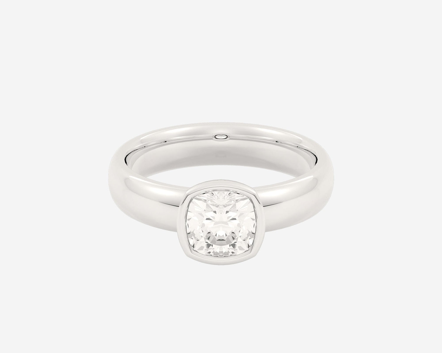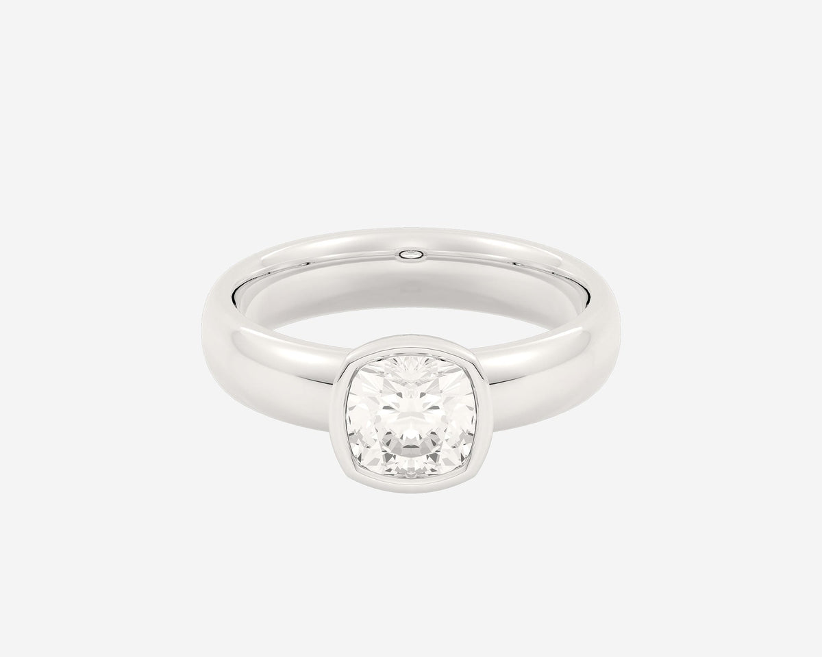 This Low Set Bezel Solitaire — Cushion ring by Holden is a delicate celebration of minimalism and comfort. Featuring a low bezel setting that gently cradles a cushion-cut lab-grown diamond on a comfort-fit band, it symbolizes understated elegance and lifelong commitment. Customizable in width, metal, and finish, it is crafted to order for a truly personal experience.