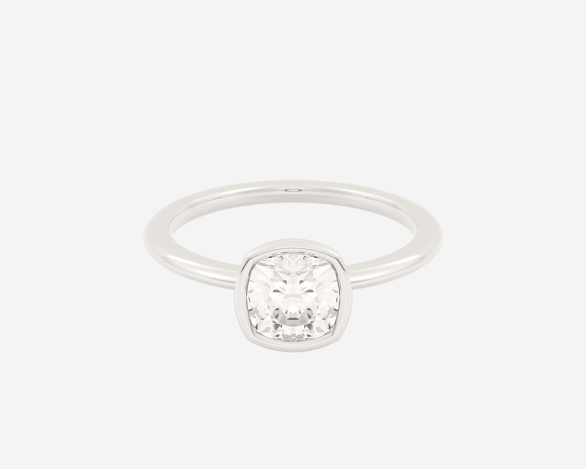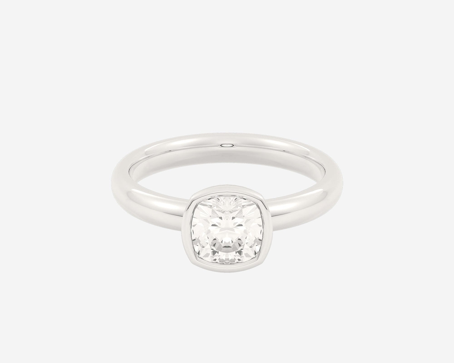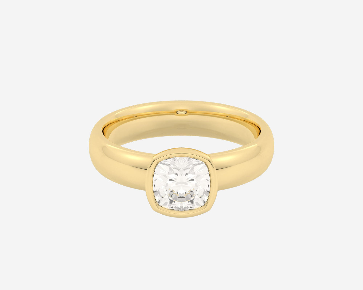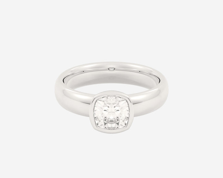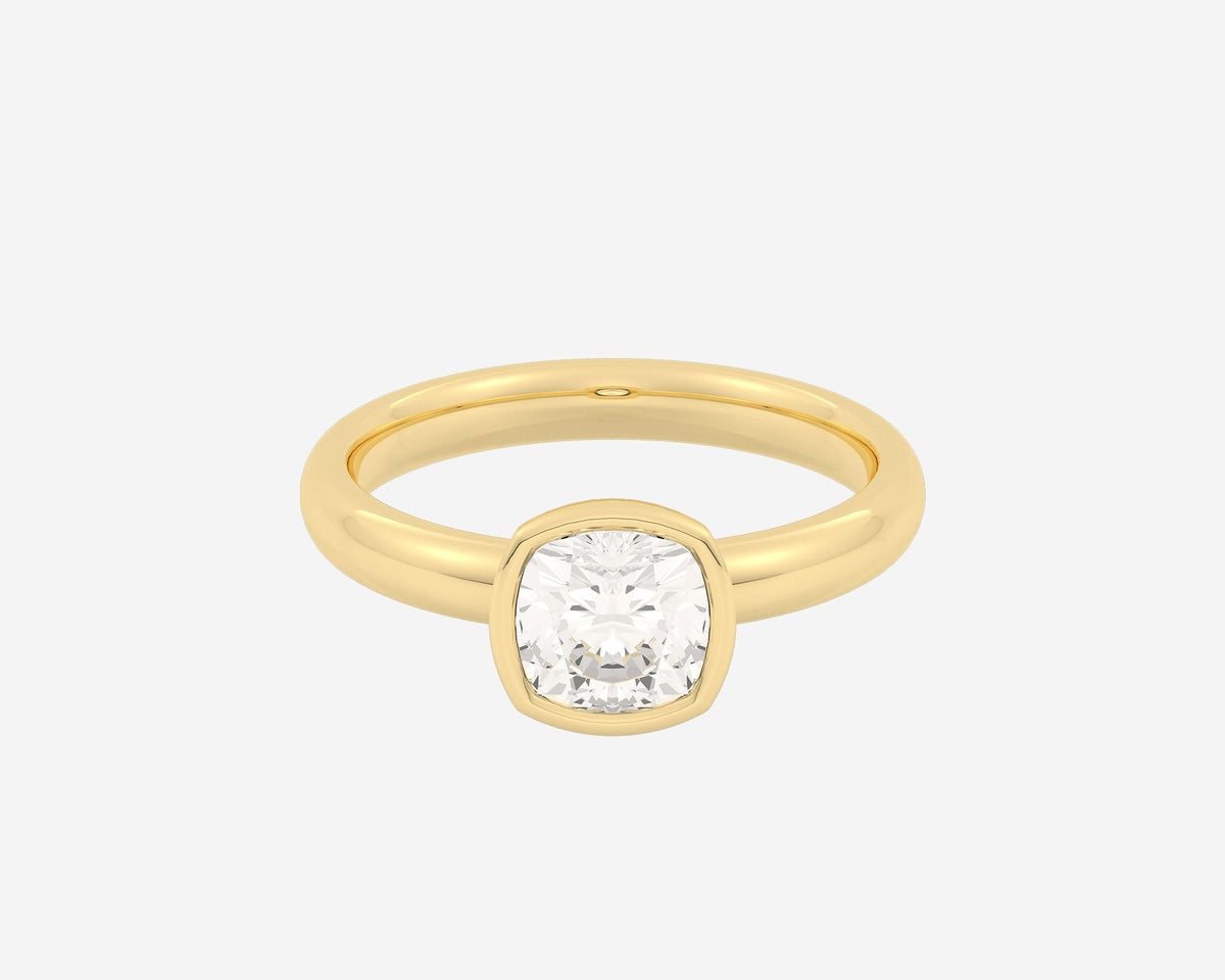 This Low Set Bezel Solitaire — Cushion ring by Holden is a delicate celebration of minimalism and comfort. Featuring a low bezel setting that gently cradles a cushion-cut lab-grown diamond on a comfort-fit band, it symbolizes understated elegance and lifelong commitment. Customizable in width, metal, and finish, it is crafted to order for a truly personal experience.