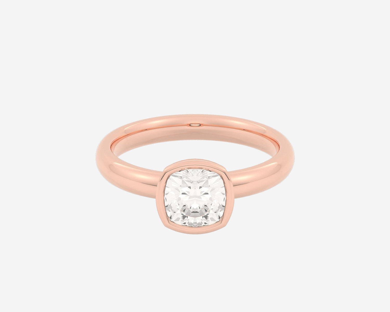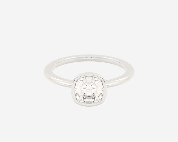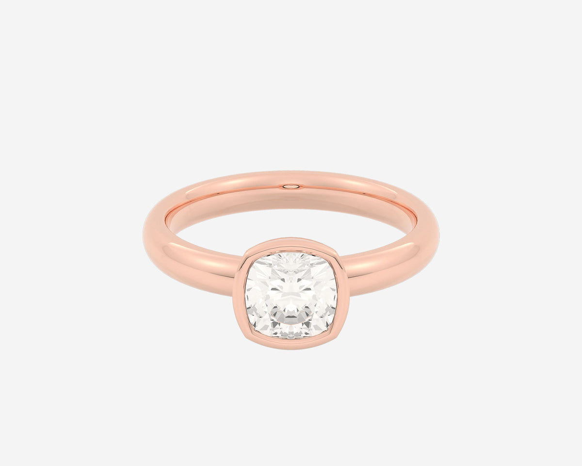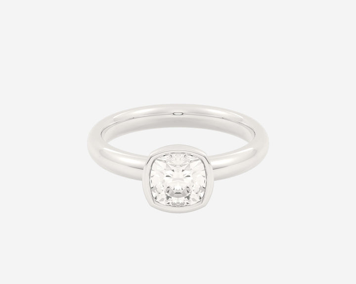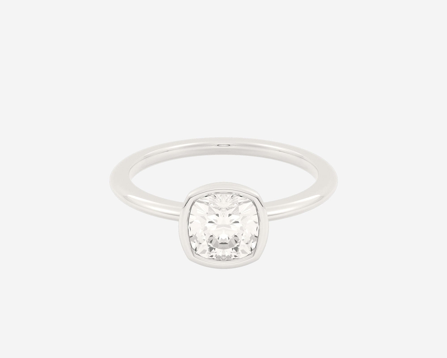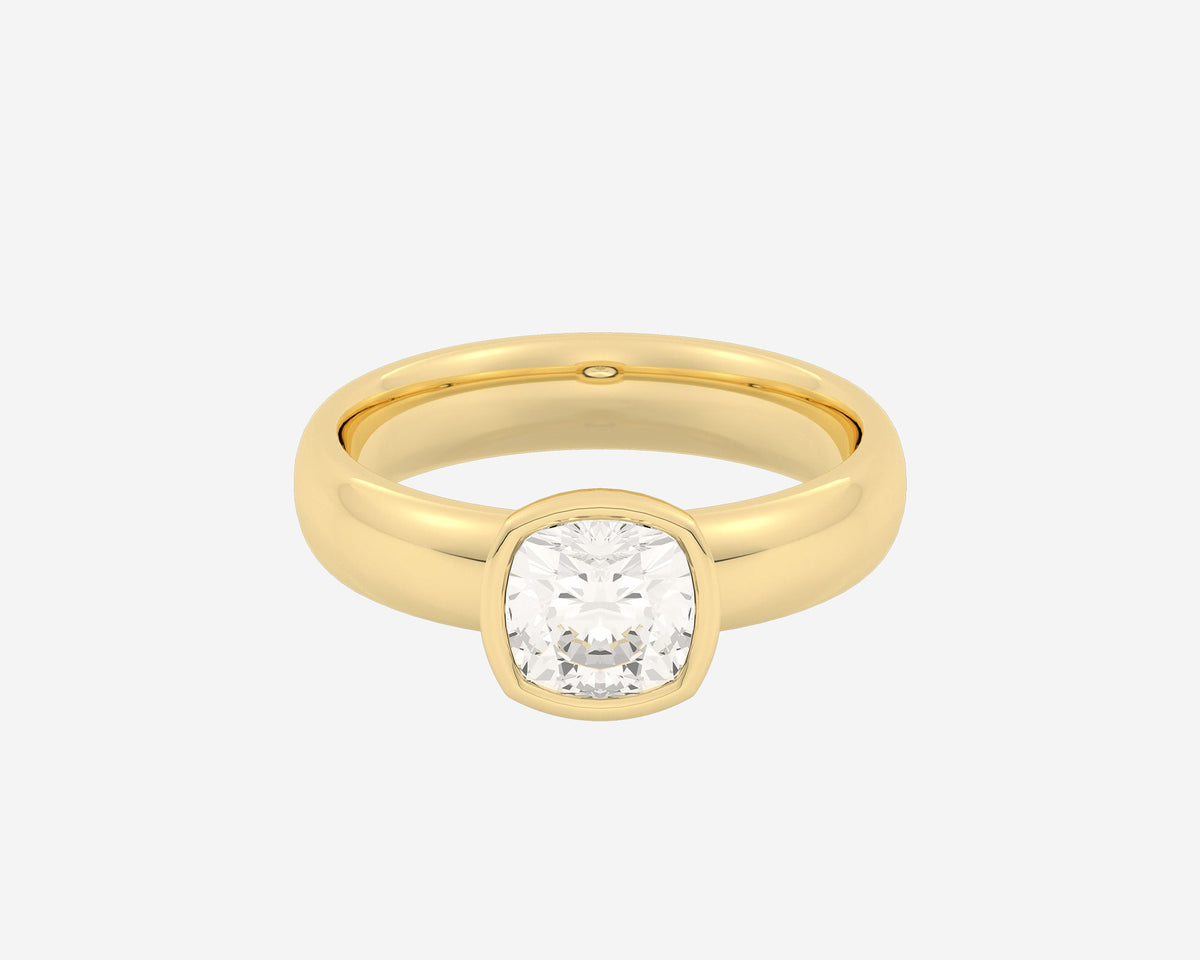This Low Set Bezel Solitaire — Cushion ring by Holden is a delicate celebration of minimalism and comfort. Featuring a low bezel setting that gently cradles a cushion-cut lab-grown diamond on a comfort-fit band, it symbolizes understated elegance and lifelong commitment. Customizable in width, metal, and finish, it is crafted to order for a truly personal experience.