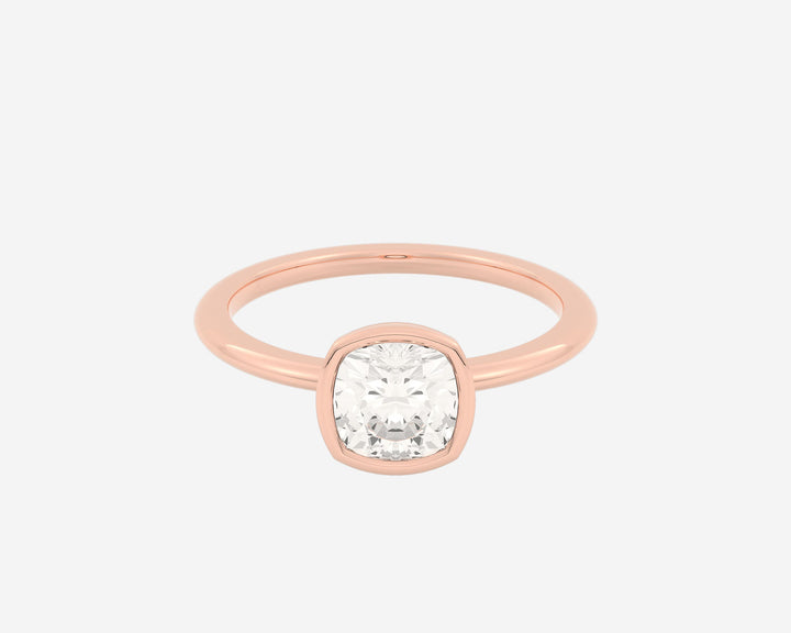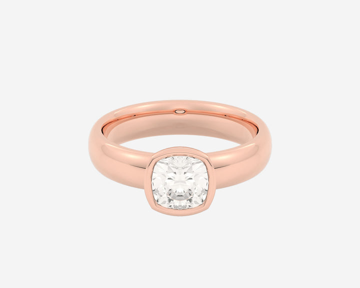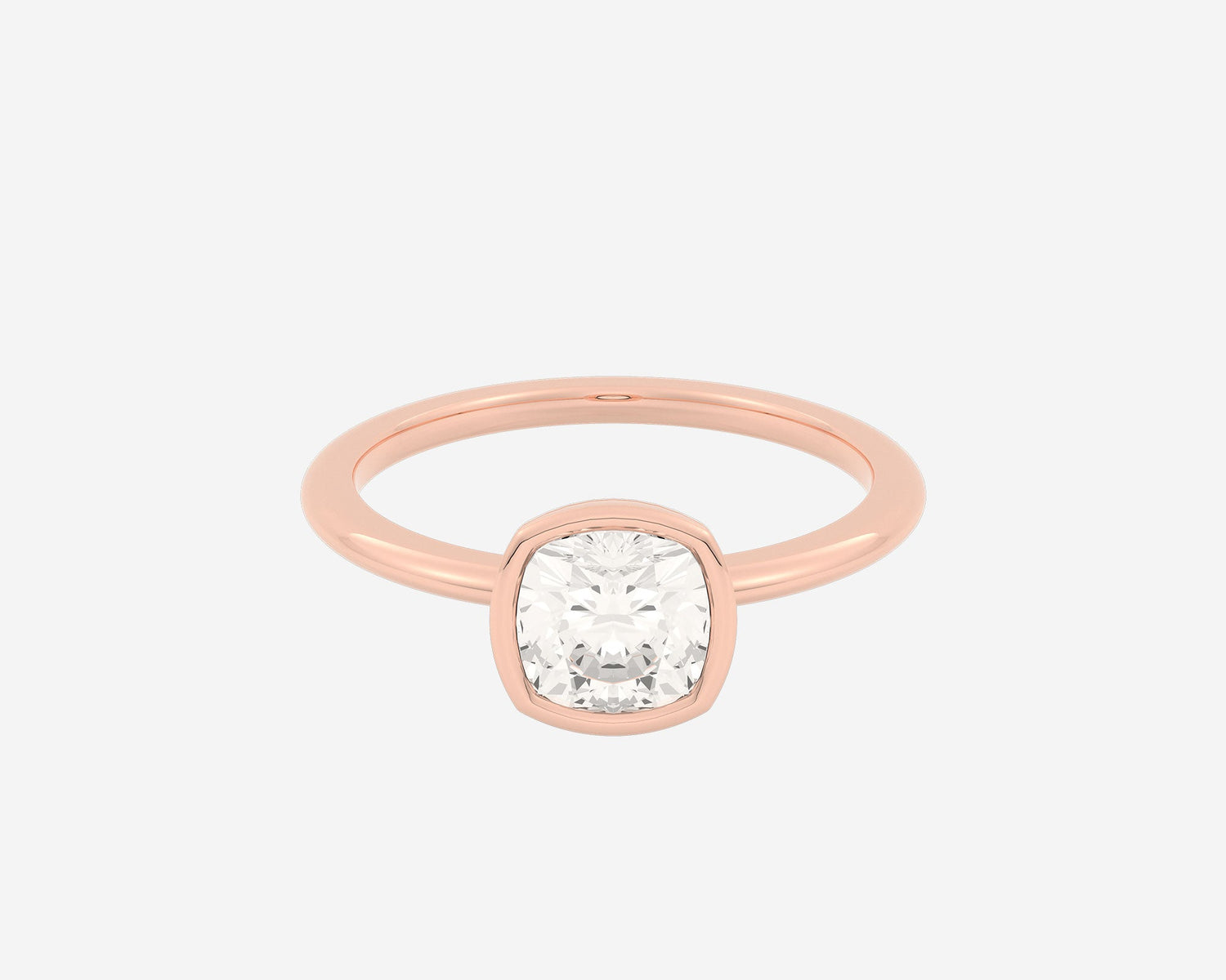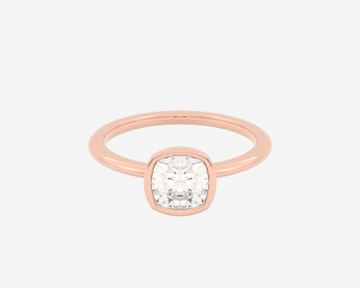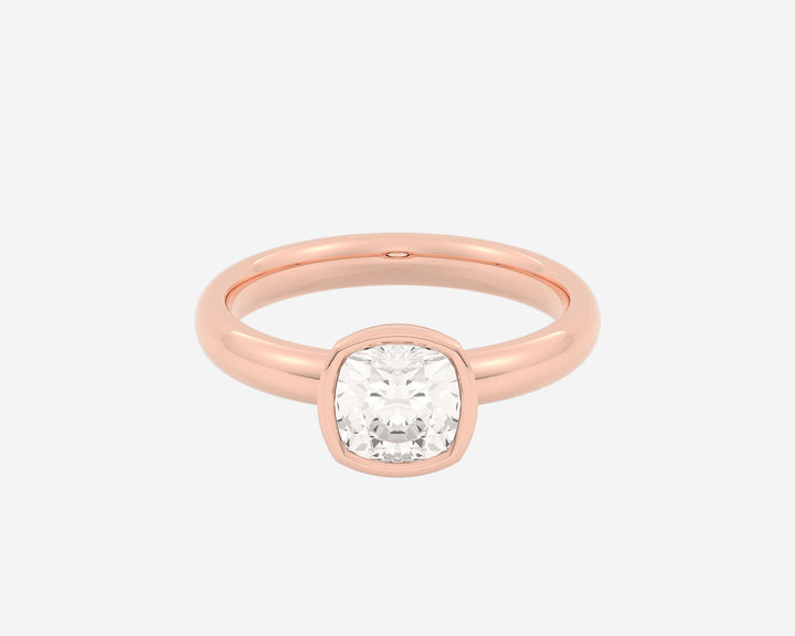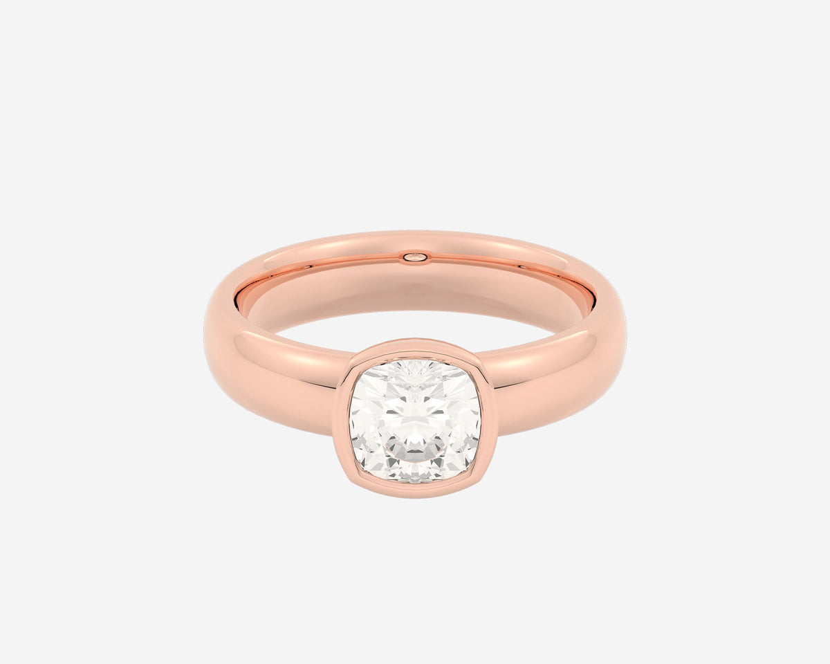 This Low Set Bezel Solitaire — Cushion ring by Holden is a delicate celebration of minimalism and comfort. Featuring a low bezel setting that gently cradles a cushion-cut lab-grown diamond on a comfort-fit band, it symbolizes understated elegance and lifelong commitment. Customizable in width, metal, and finish, it is crafted to order for a truly personal experience.