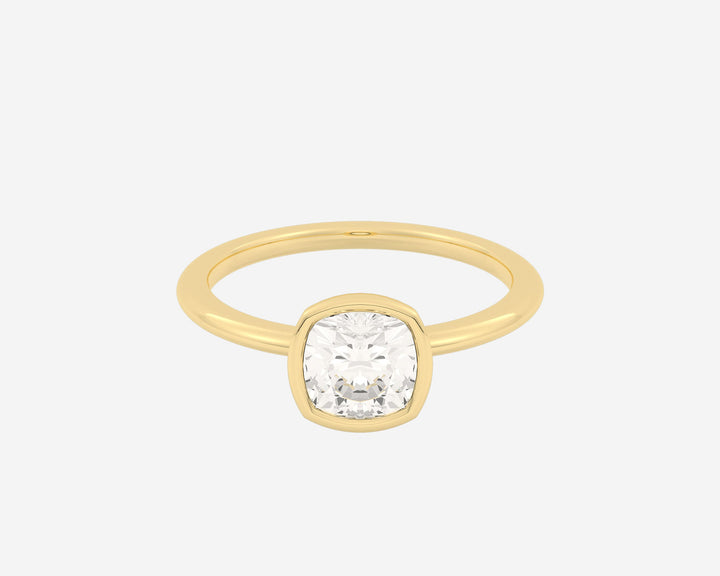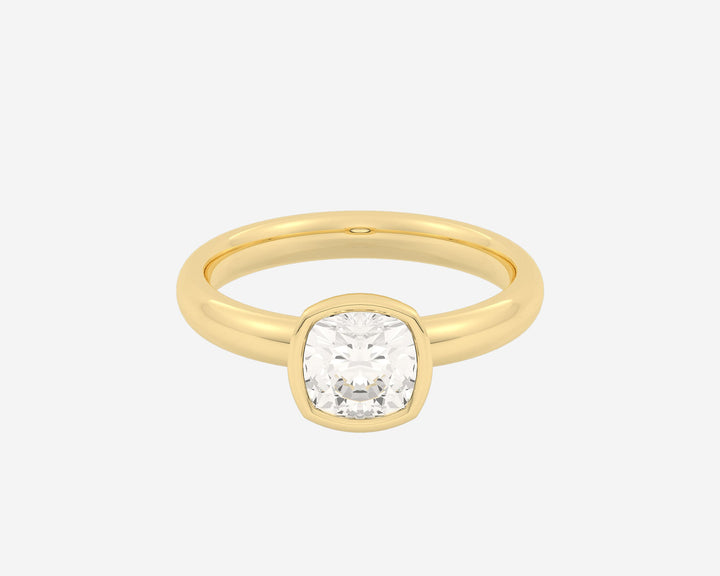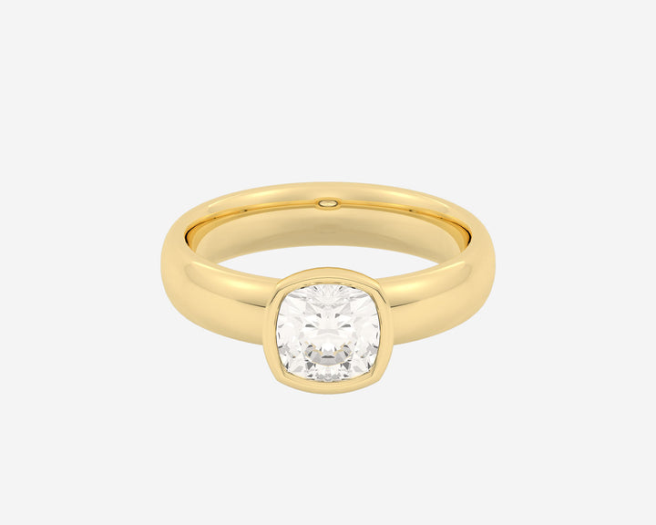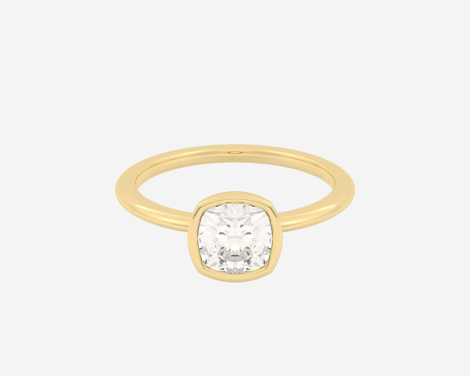 Handcrafted in 14k yellow gold, 1.5mm band width with bezel-set lab-grown cushion-cut diamond.