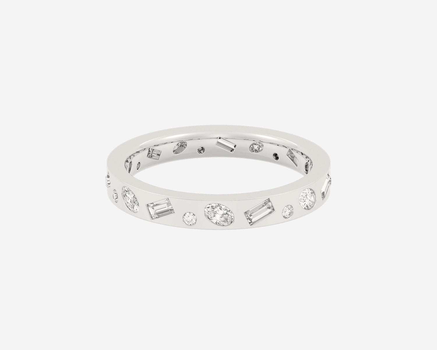This Mixed Stone Royal Flush ring by Holden features a burnished finish with a unique mix of round, baguette, and oval lab-grown diamonds set all around the comfort-fit band. A statement piece suitable as a wedding band or an everyday stackable ring, it is custom-made with expert craftsmanship and sustainable materials.