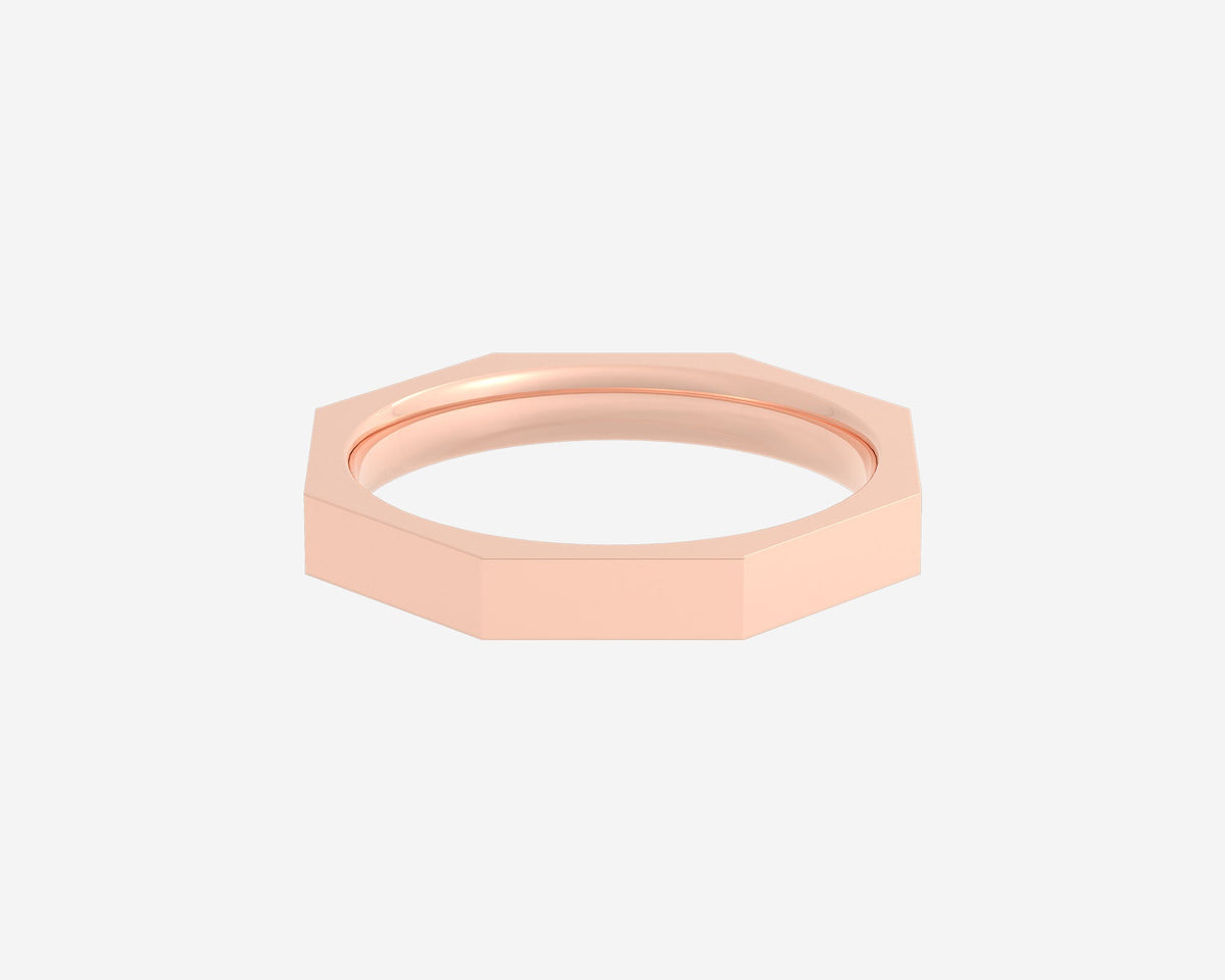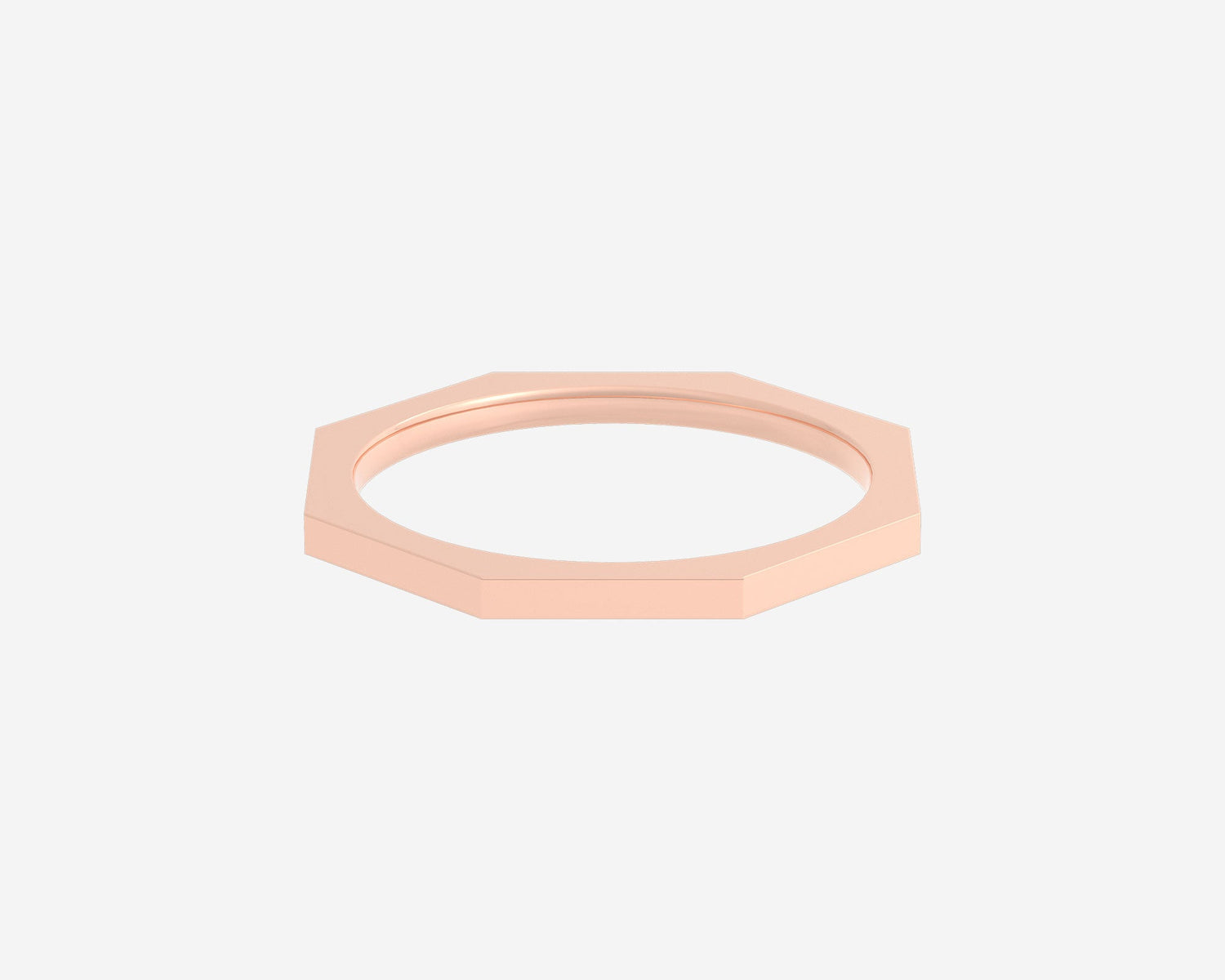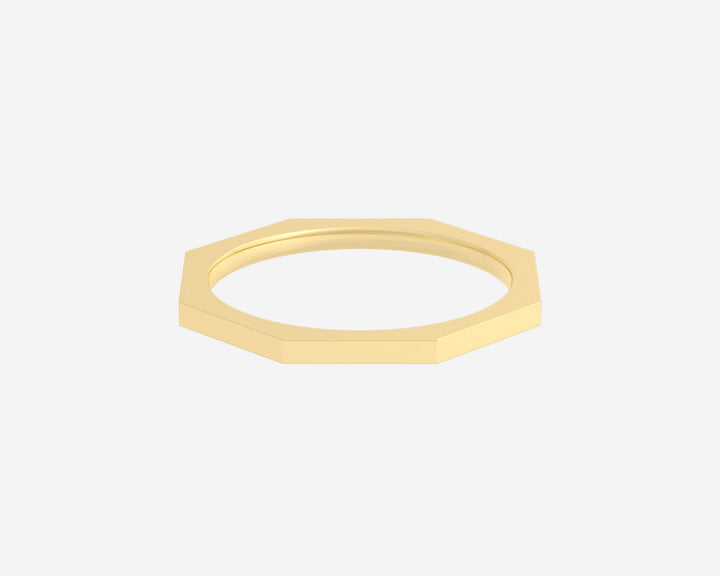 This Octagon ring by Holden is defined by its 1.5mm width and unique eight-sided silhouette, offering an avant-garde yet refined look. The unisex comfort-fit design provides comfort alongside its bold architectural style. This ring conveys individuality and modernity, custom crafted with ethical materials in New York City.