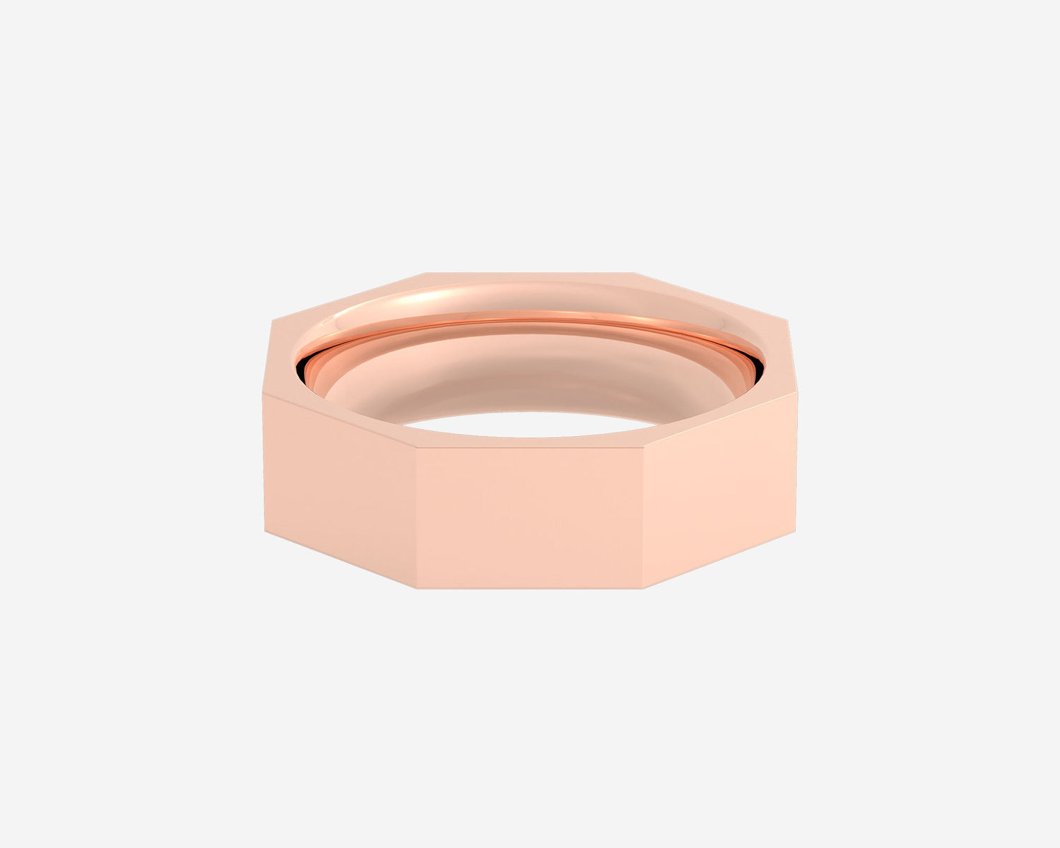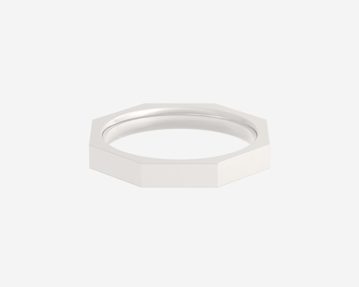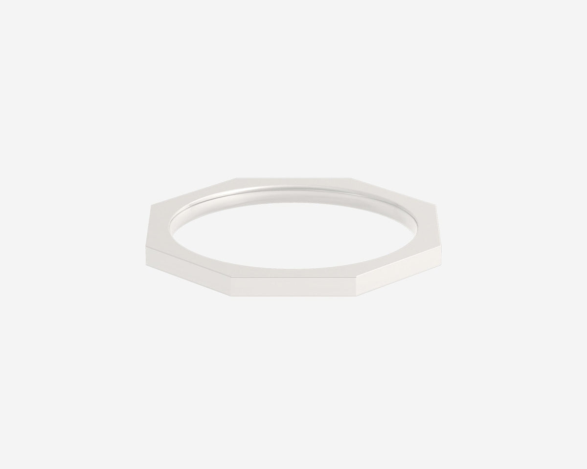 This Octagon ring by Holden is defined by its 1.5mm width and unique eight-sided silhouette, offering an avant-garde yet refined look. The unisex comfort-fit design provides comfort alongside its bold architectural style. This ring conveys individuality and modernity, custom crafted with ethical materials in New York City.