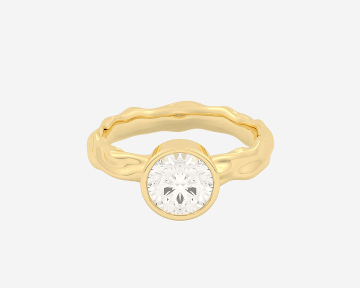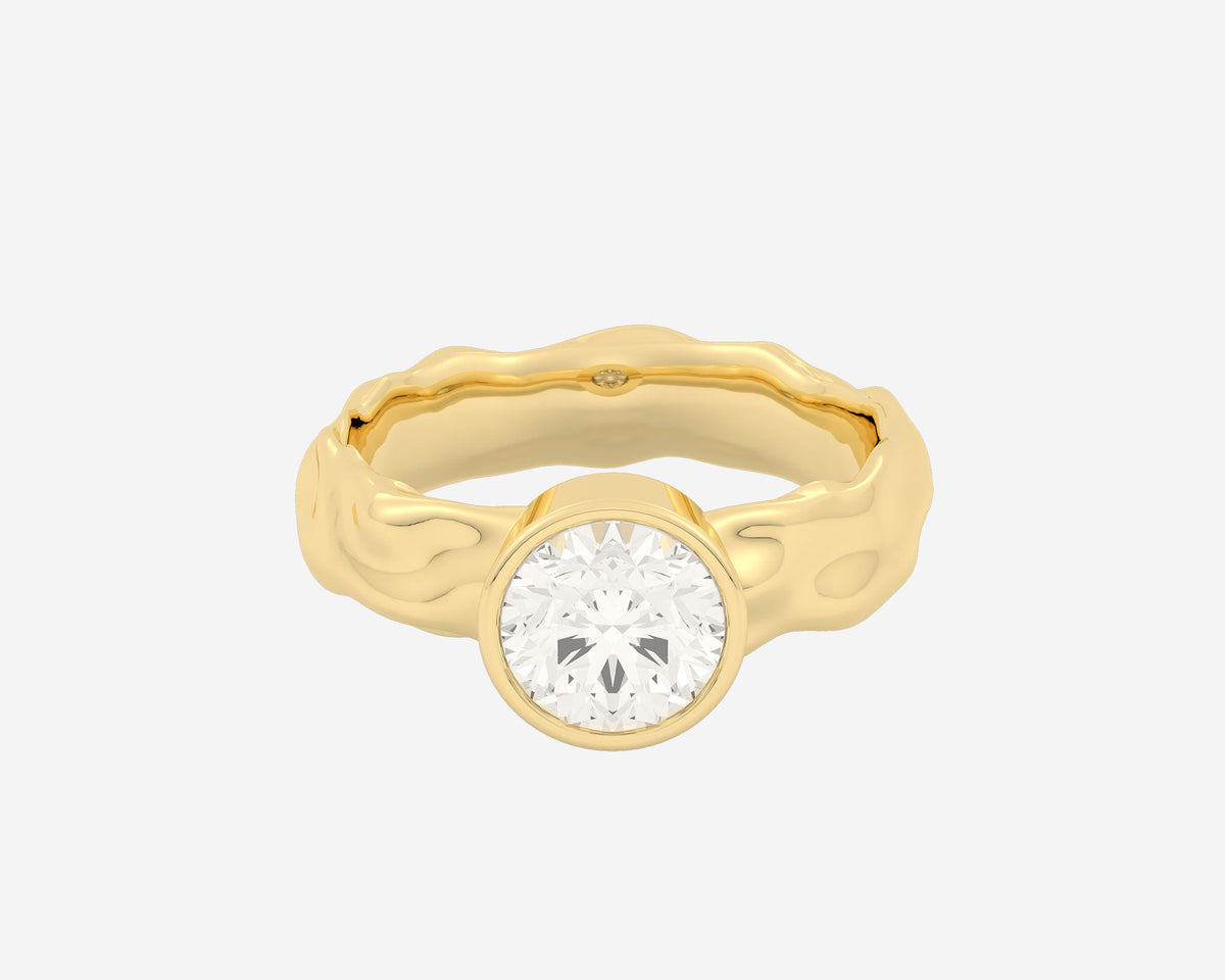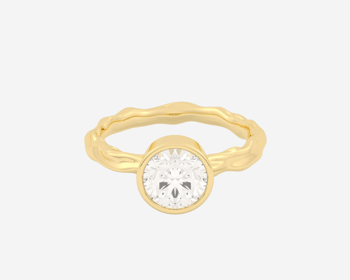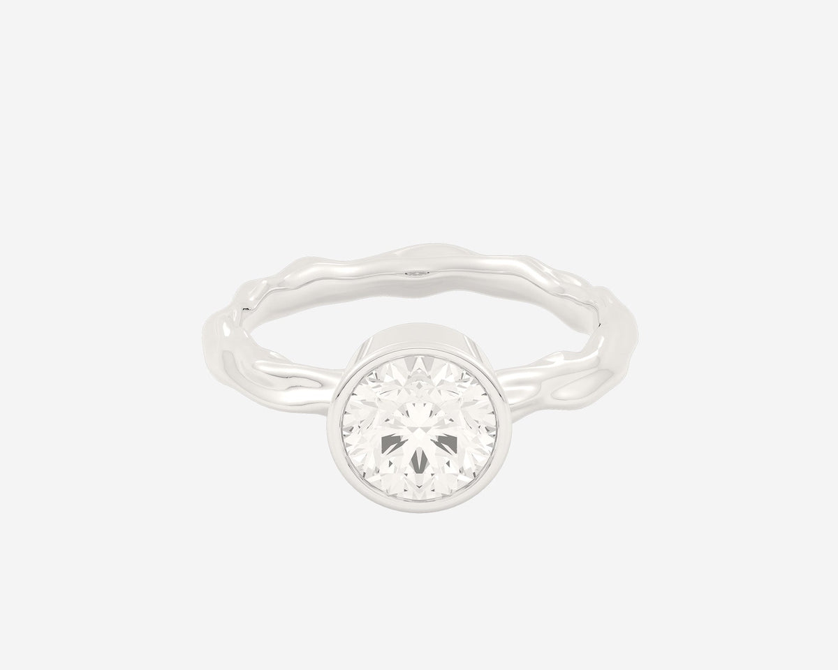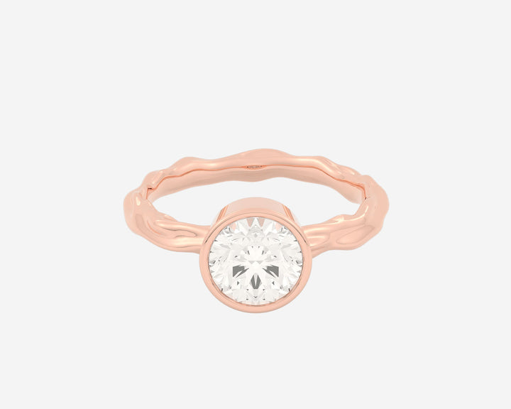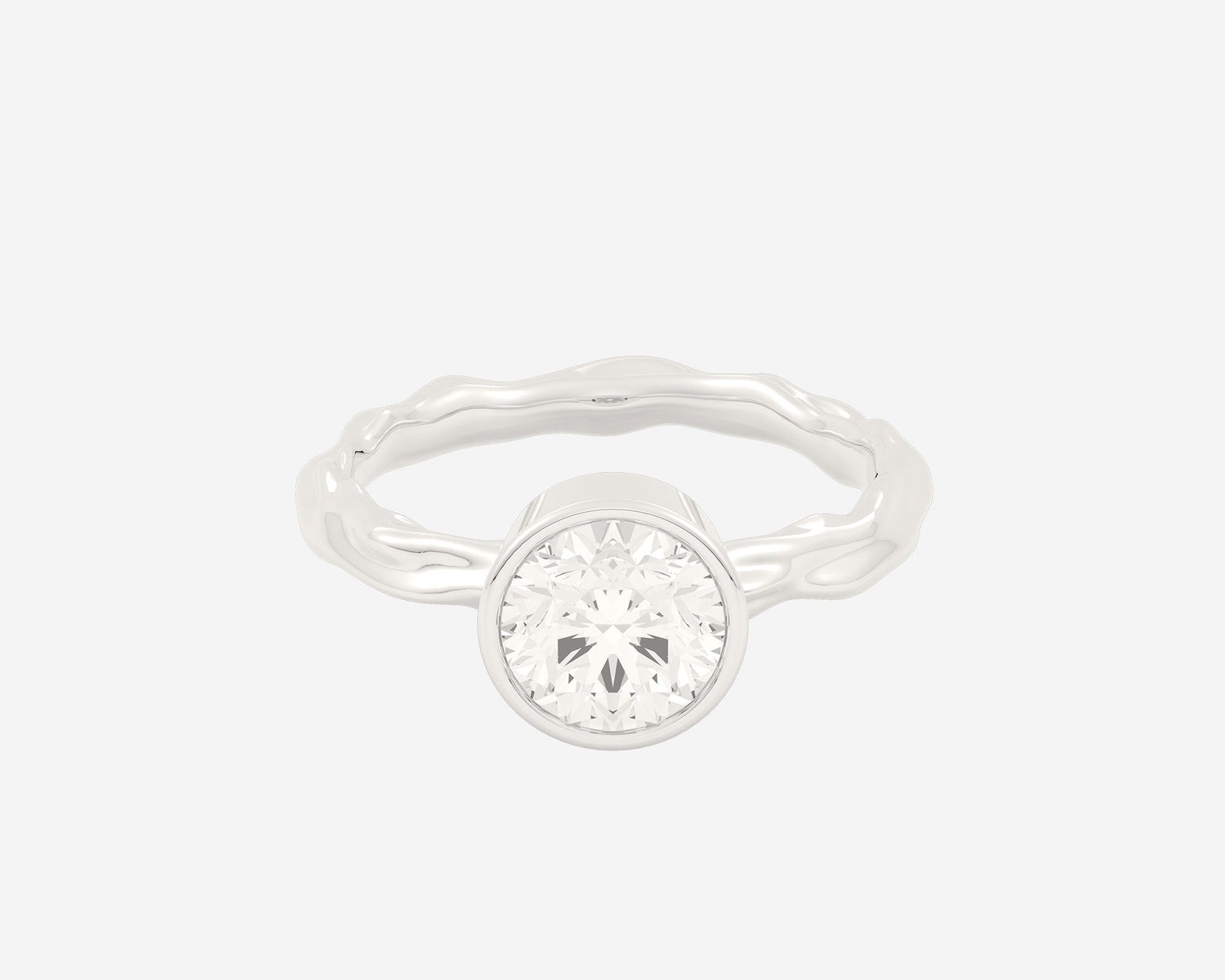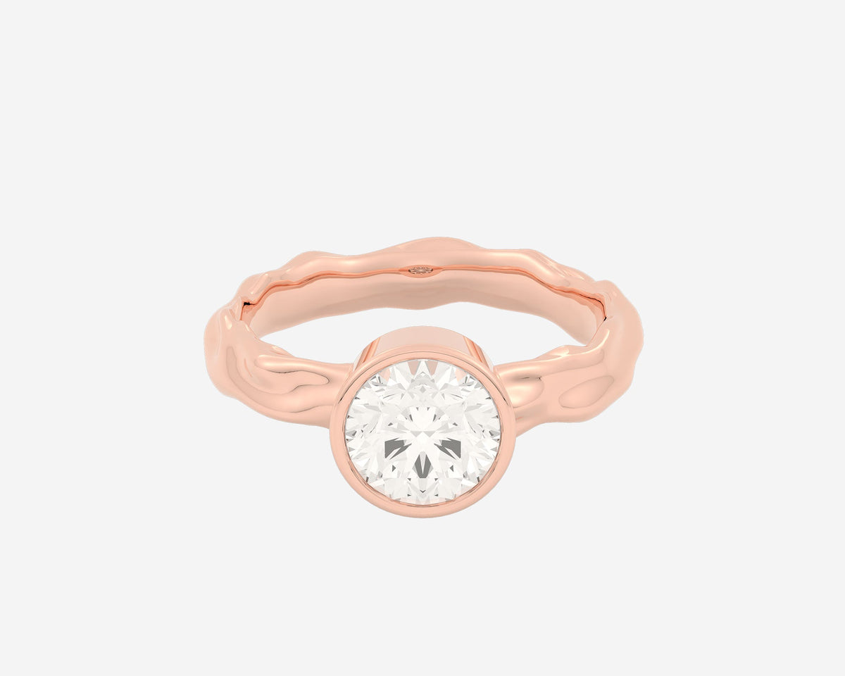 This Organic Bezel Solitaire — Round ring by Holden combines a lab-grown round-cut diamond set in a sleek bezel with a textured, organic-inspired band. Available in 14k or 18k yellow, white, or rose gold, or platinum, this bold and unique engagement ring is custom-crafted to order for a distinct and contemporary expression of love.
