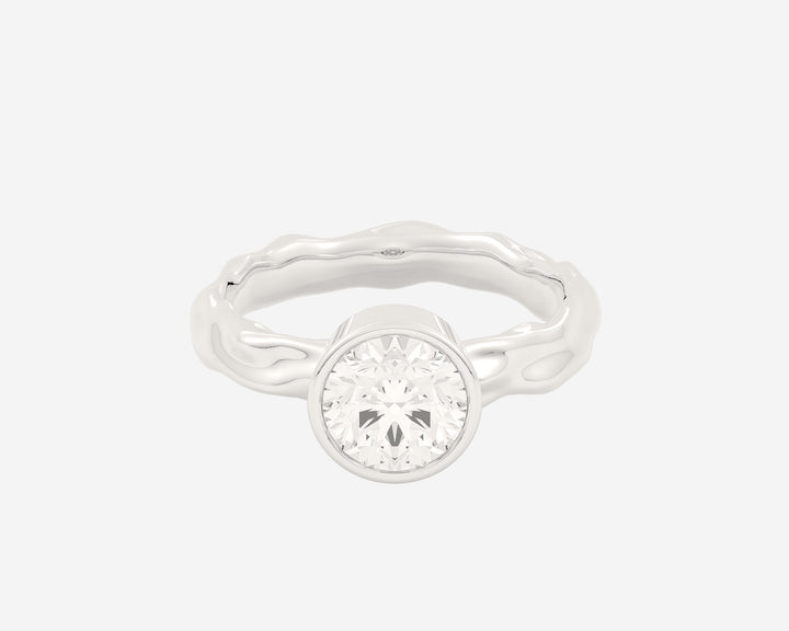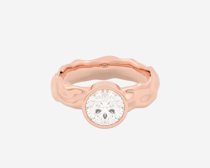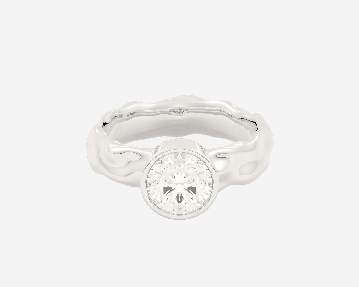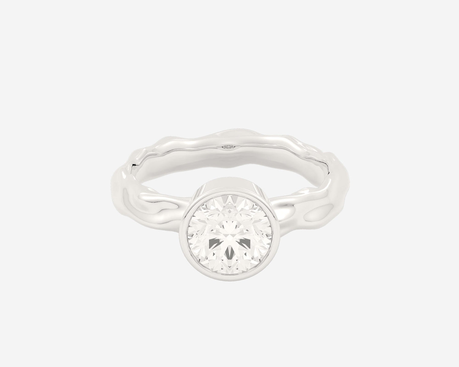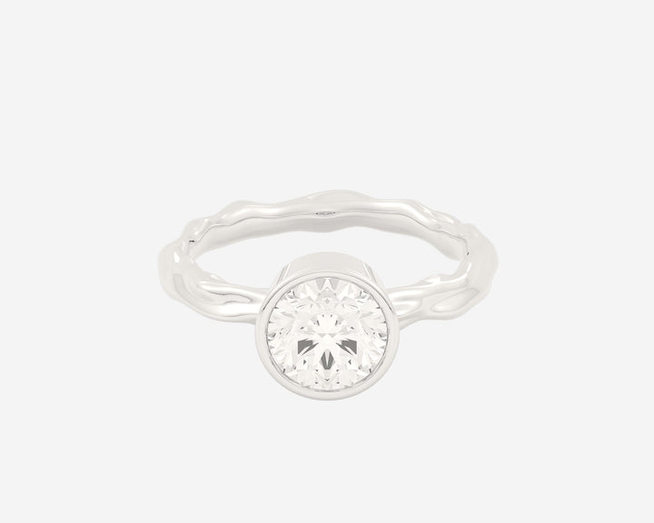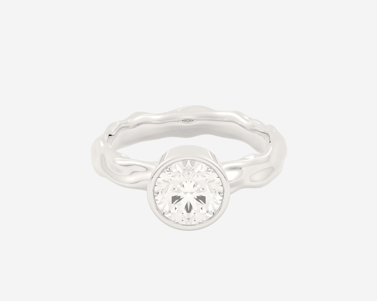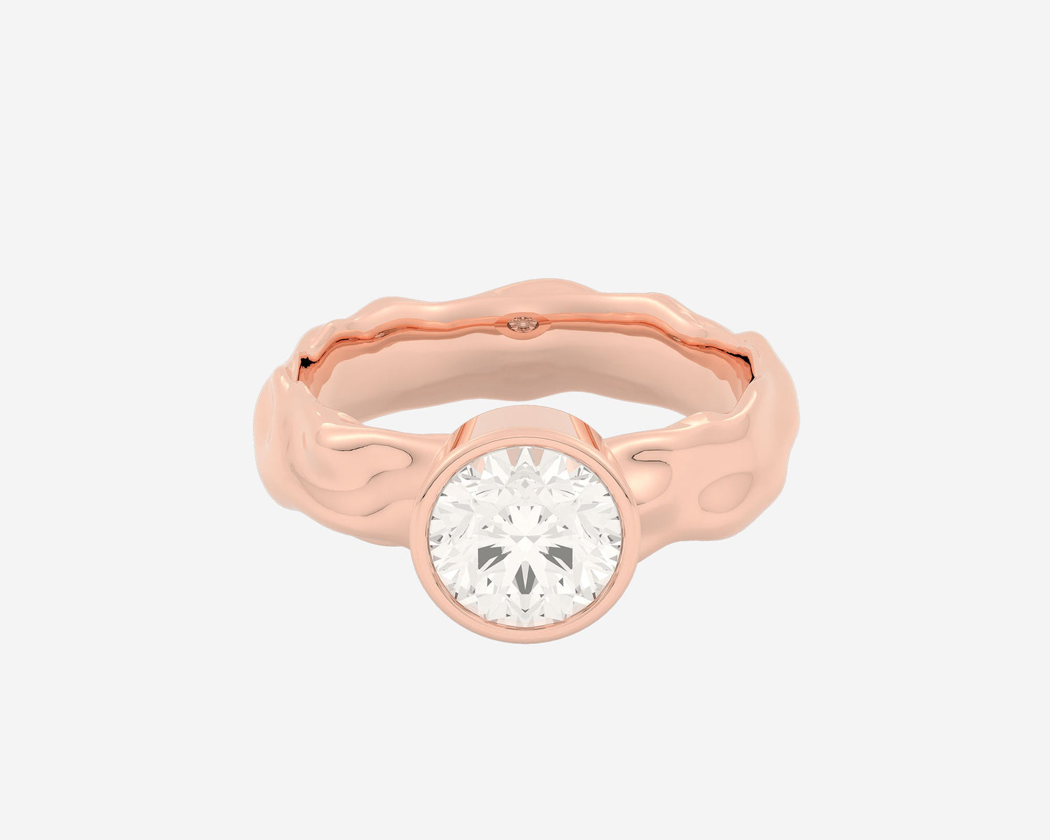 This Organic Bezel Solitaire — Round ring by Holden combines a lab-grown round-cut diamond set in a sleek bezel with a textured, organic-inspired band. Available in 14k or 18k yellow, white, or rose gold, or platinum, this bold and unique engagement ring is custom-crafted to order for a distinct and contemporary expression of love.