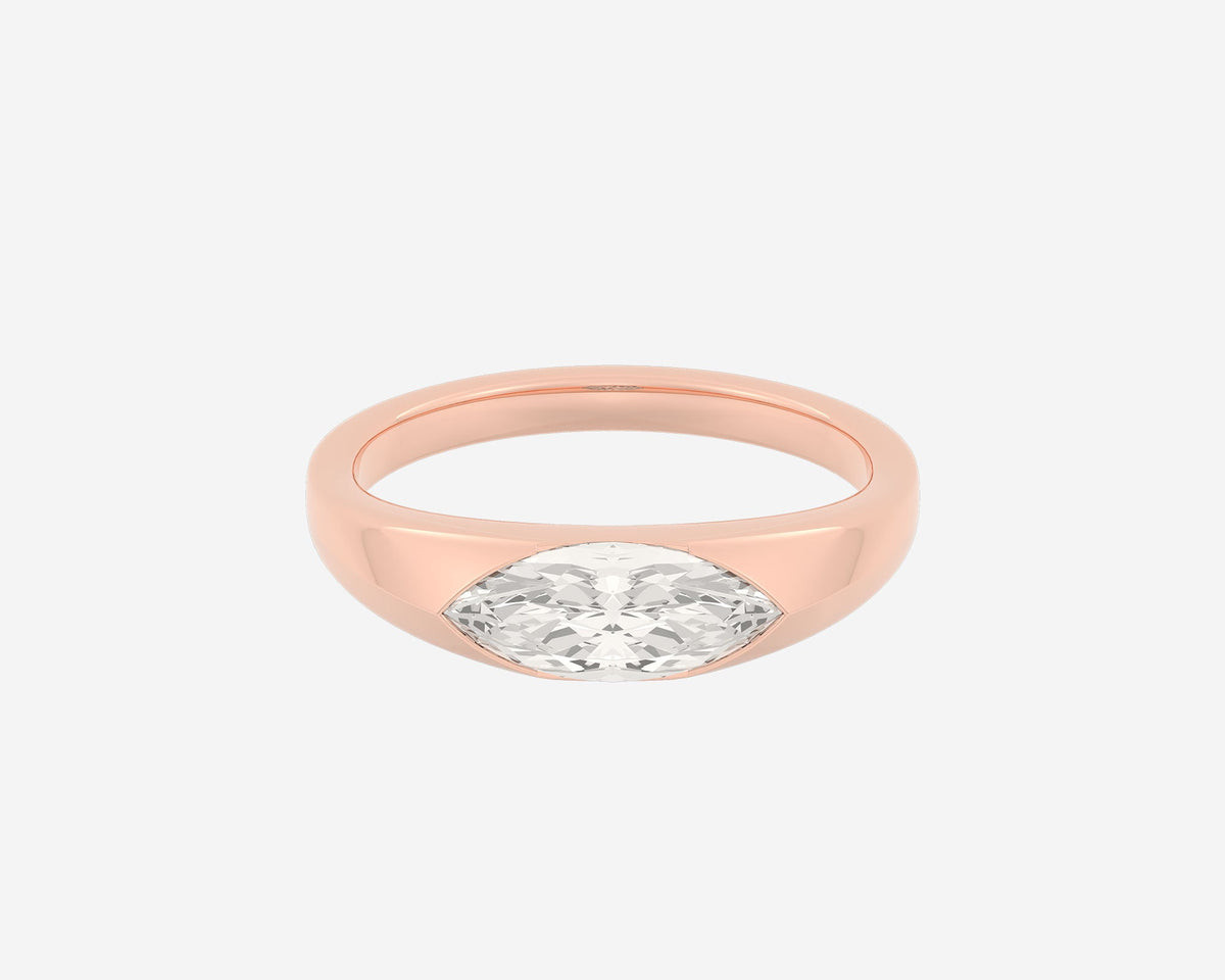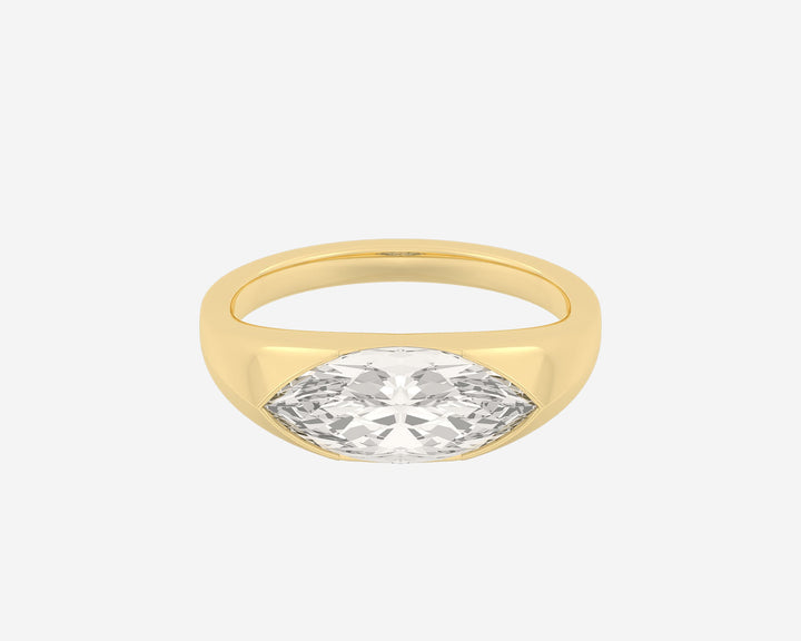This Panorama Signet ring by Holden is a modern reinterpretation of the traditional signet, featuring a horizontal marquise lab-grown diamond center set in a tapered band. The bold, clean-lined silhouette is designed to flatter all genders and finger sizes, making it a versatile statement piece crafted with care and expert artistry.