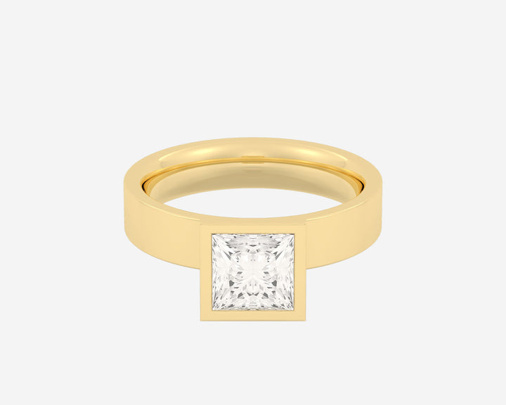 Handcrafted in 14k yellow gold with a princess-cut lab-grown diamond. Band width measures 1.5mm. Made from recycled metals and ethical lab-grown diamonds, crafted in NYC.