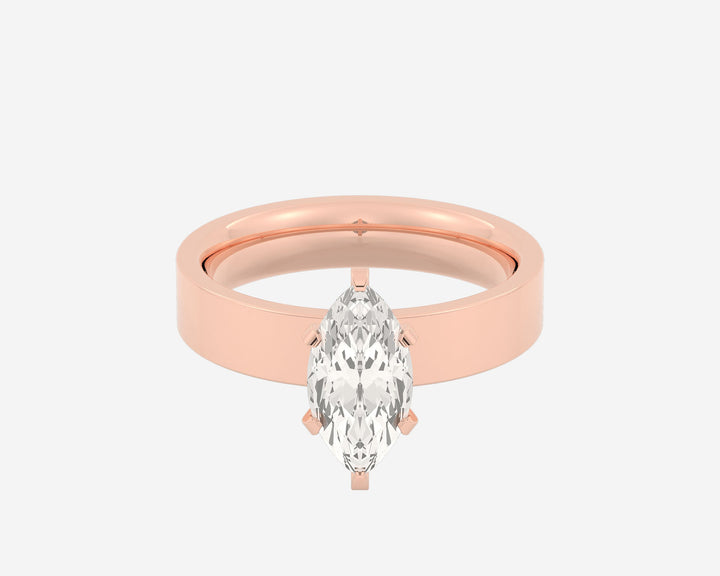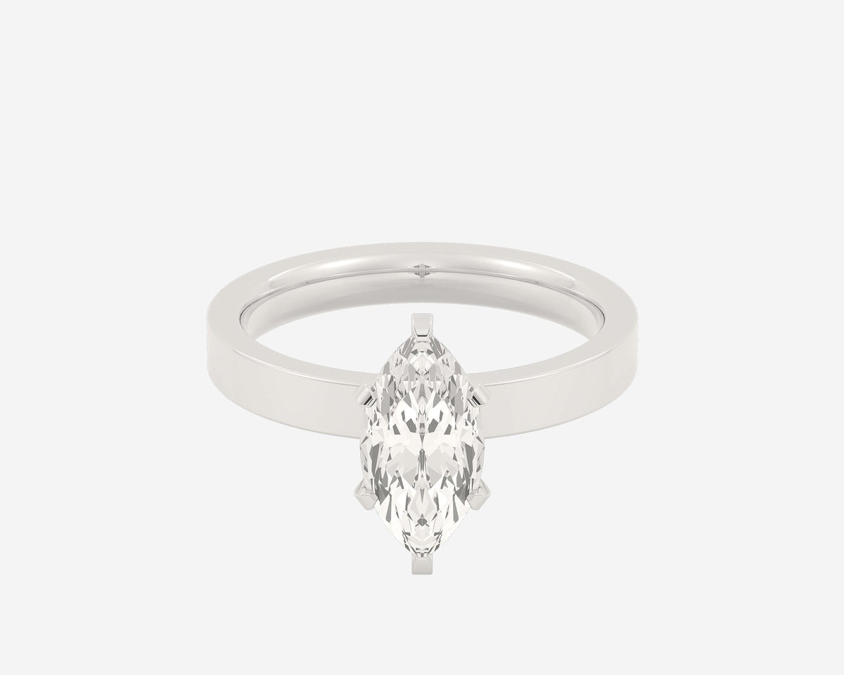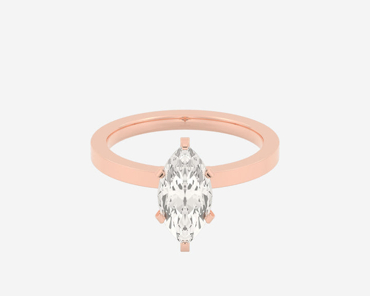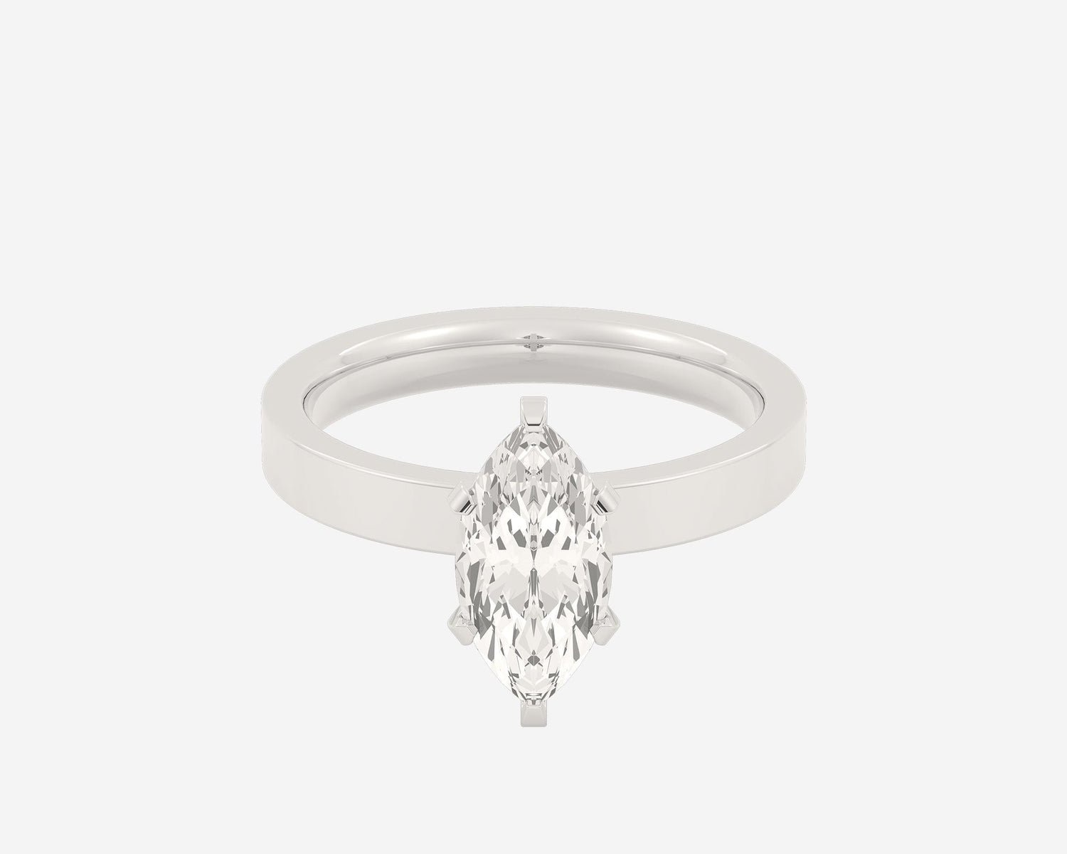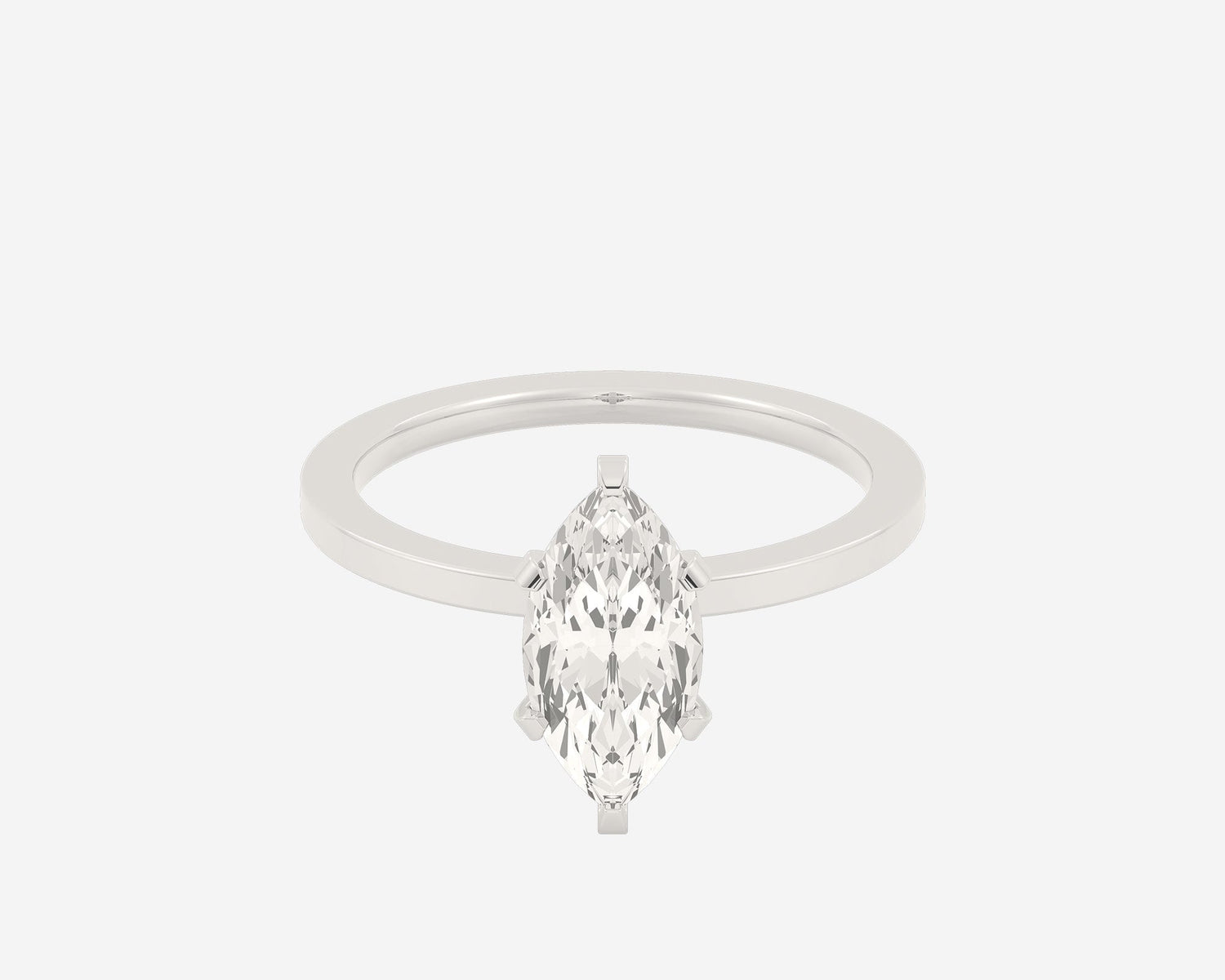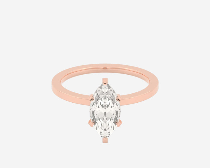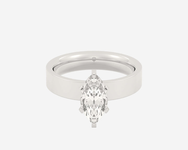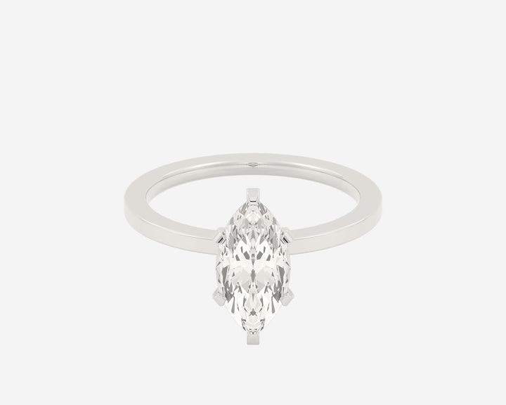 This Square Solitaire Marquise by Holden presents a marquise-cut diamond with sharp, clean lines set on a slender 1.5mm band. The design is a striking blend of modern geometry and traditional grace, symbolizing love that is both bold and enduring. Made with sustainable and ethical practices in NYC.