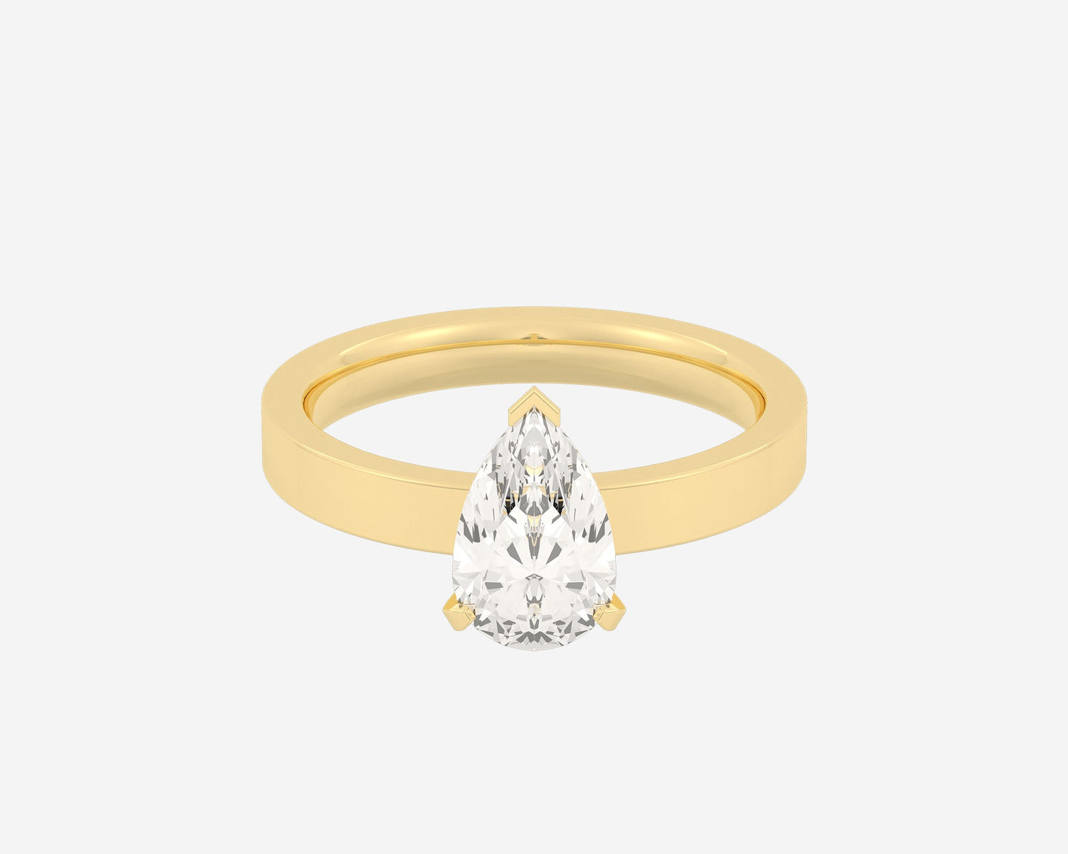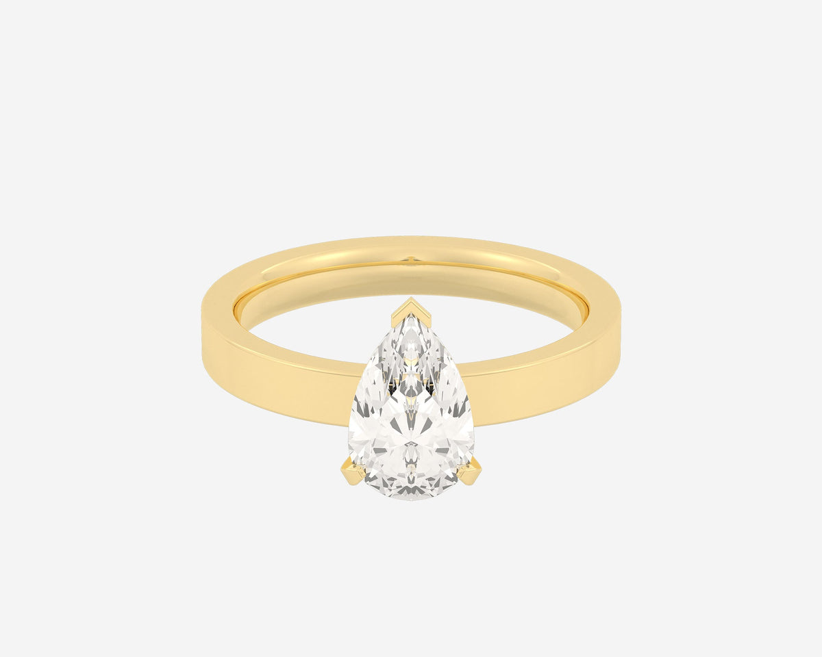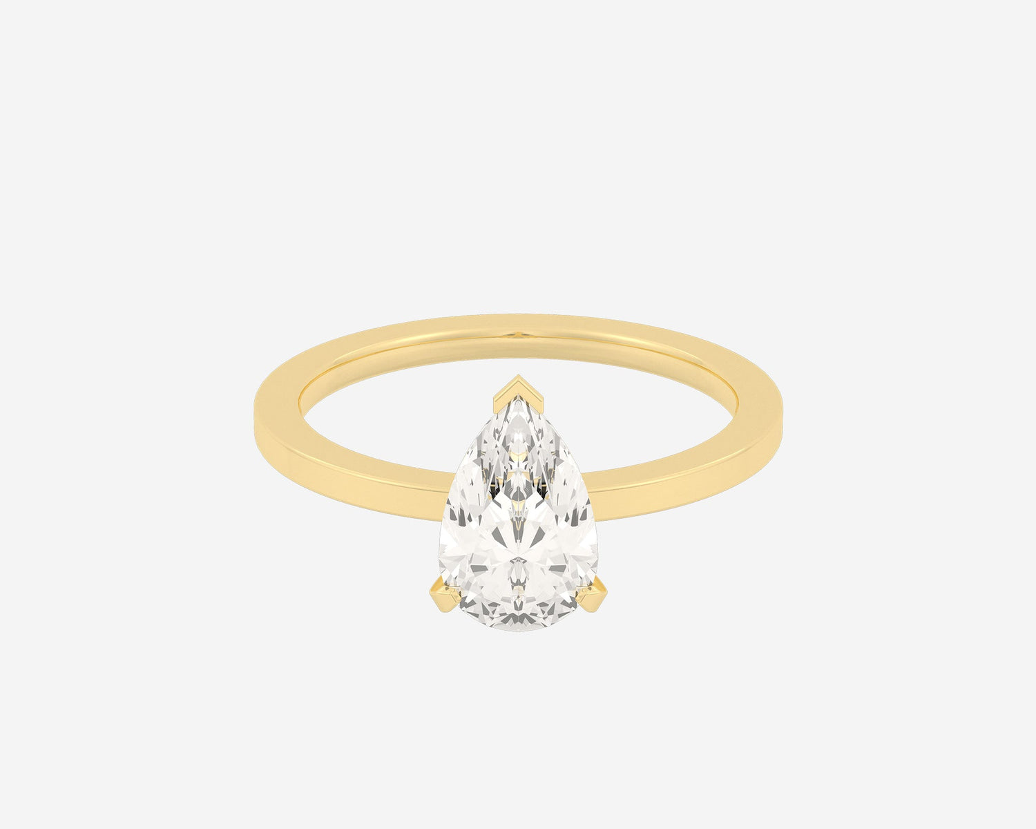 Crafted in 14k yellow gold with a lab-grown pear diamond in a square solitaire setting on a 1.5mm wide band. Available in 14k and 18k gold and 950 platinum.