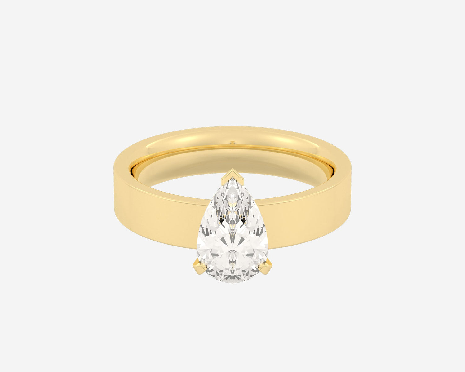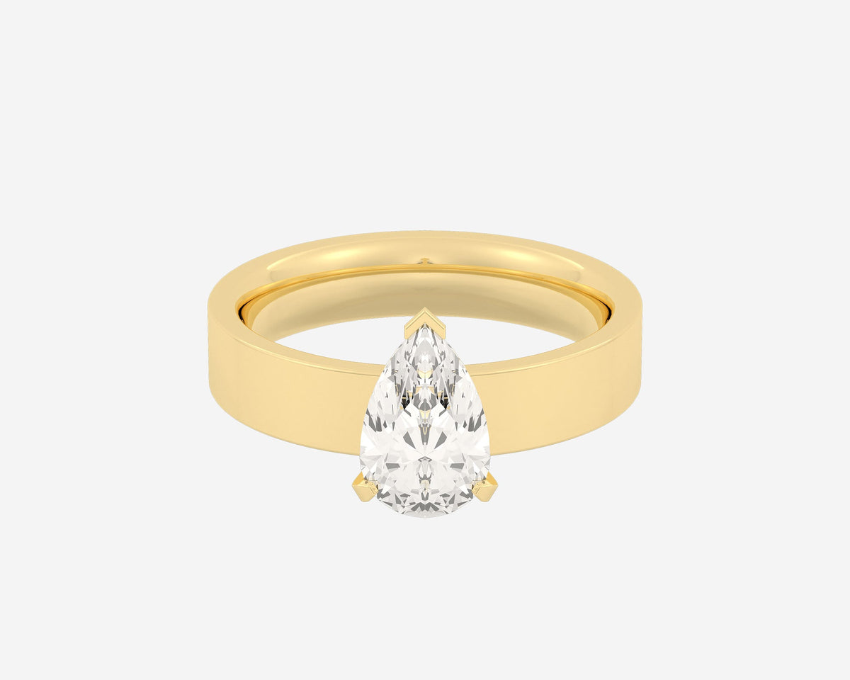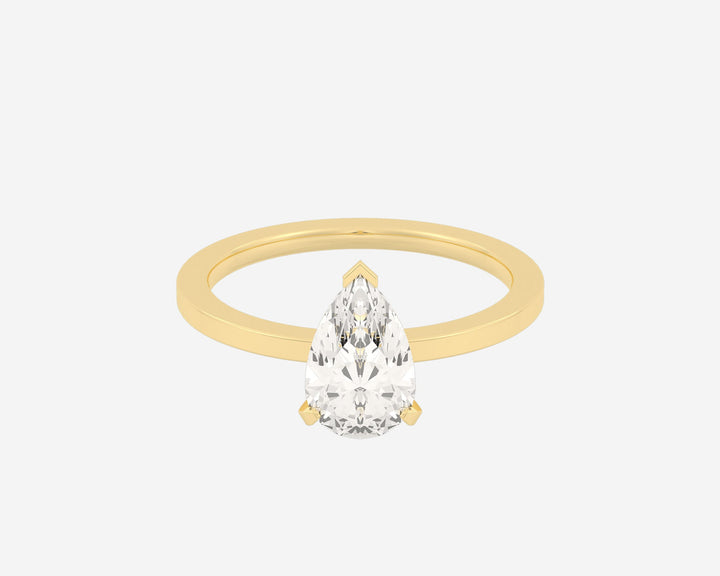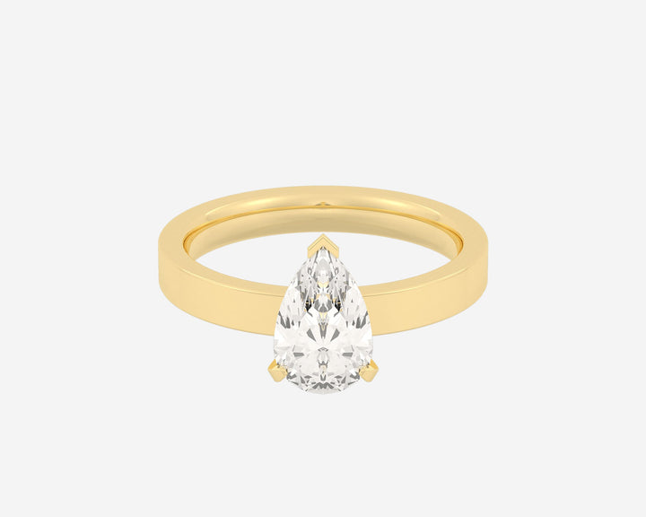 Crafted in 14k yellow gold with a lab-grown pear diamond in a square solitaire setting on a 1.5mm wide band. Available in 14k and 18k gold and 950 platinum.