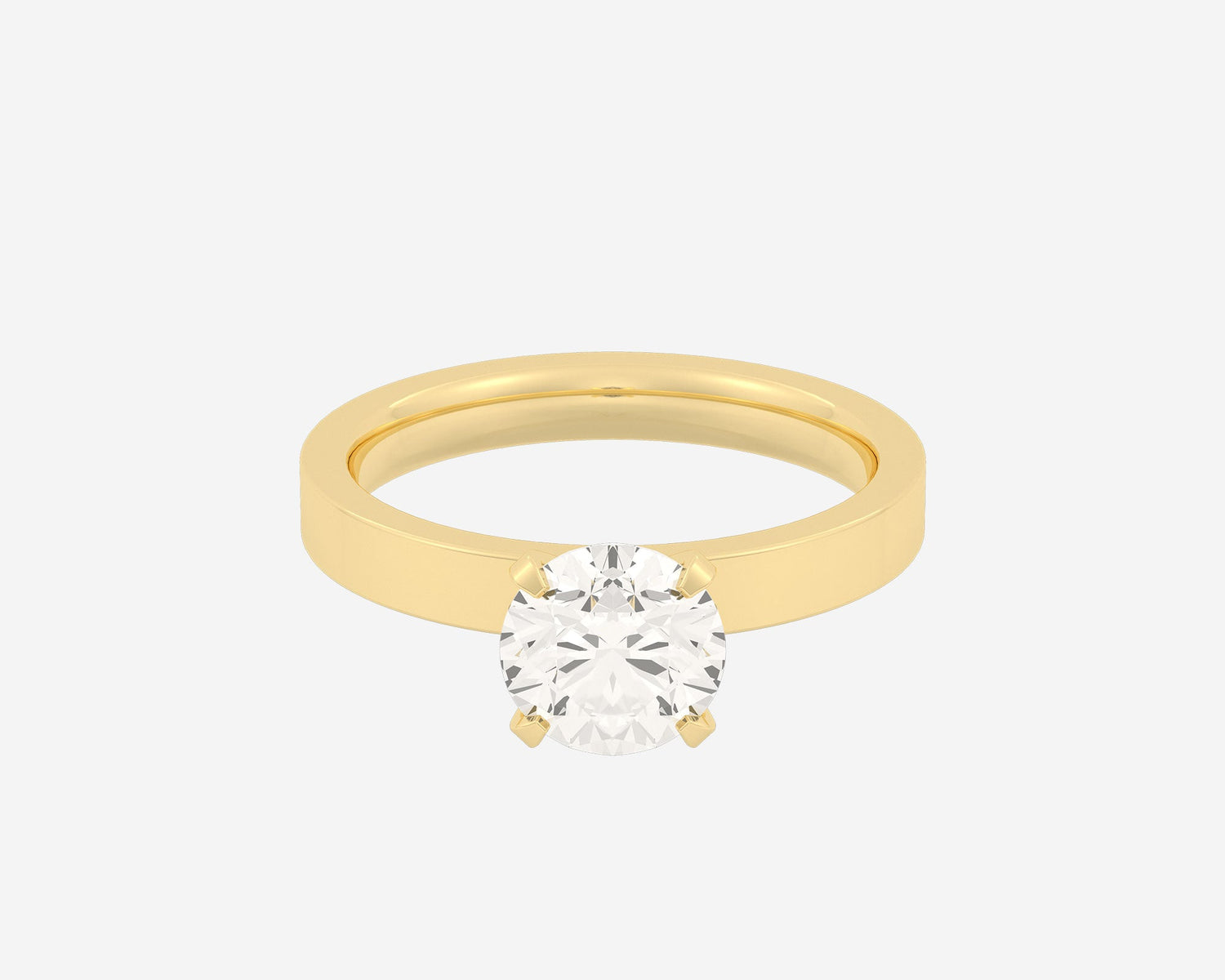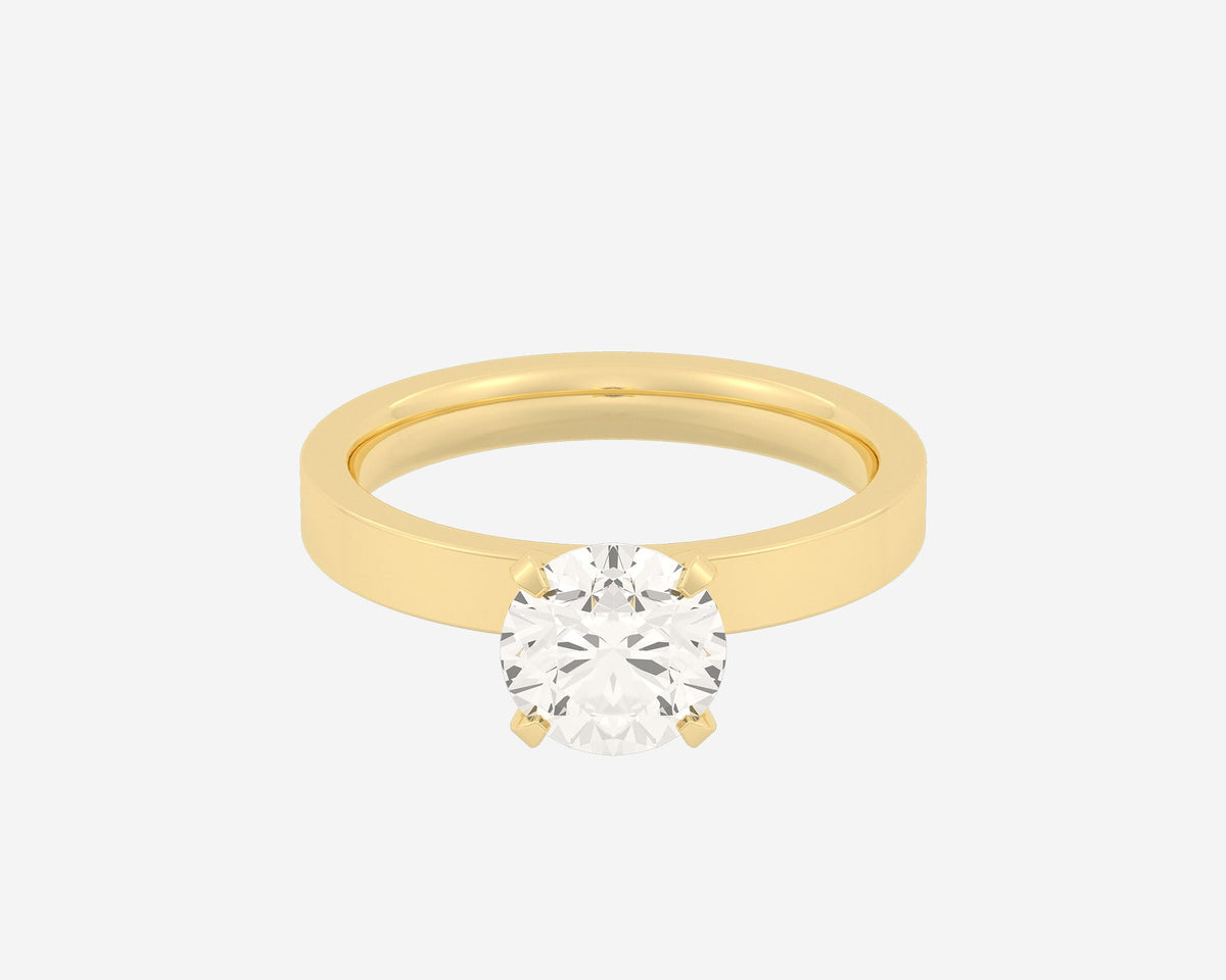 Handcrafted in 14k yellow gold with lab-grown round diamond set in a square solitaire setting on a 1.5mm wide band. Available in 14k and 18k gold and 950 platinum.