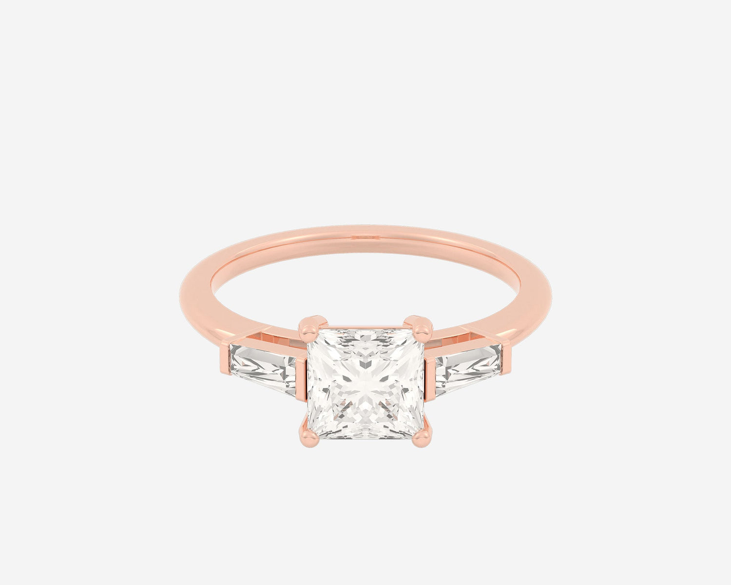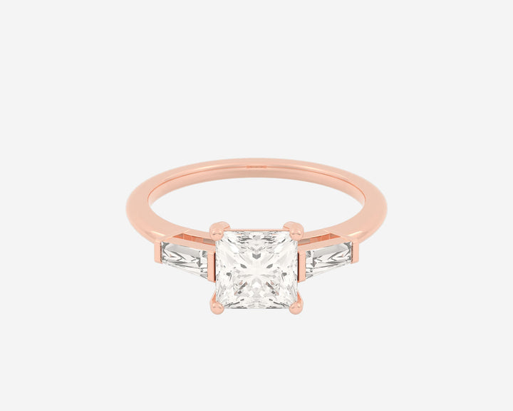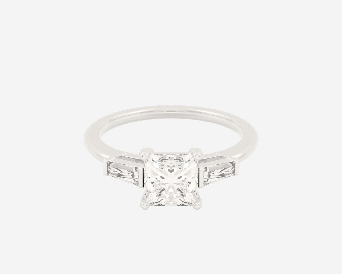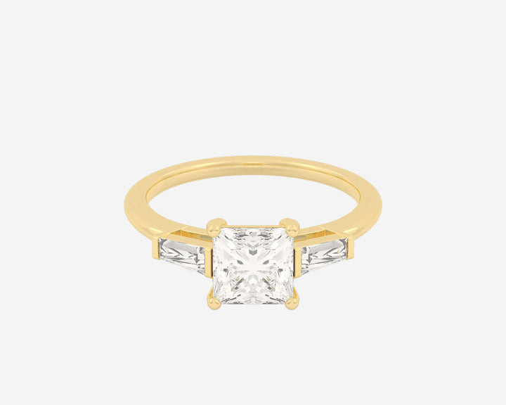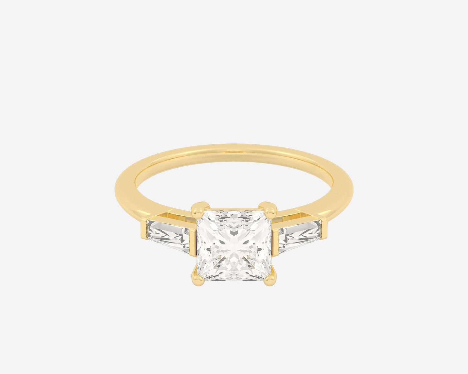 This Tapered Baguette Princess by Holden highlights a princess-cut lab-grown diamond with tapered baguette diamonds adorning the 1.5mm band. The ring balances sharp lines and sparkling accents in a sustainable design.