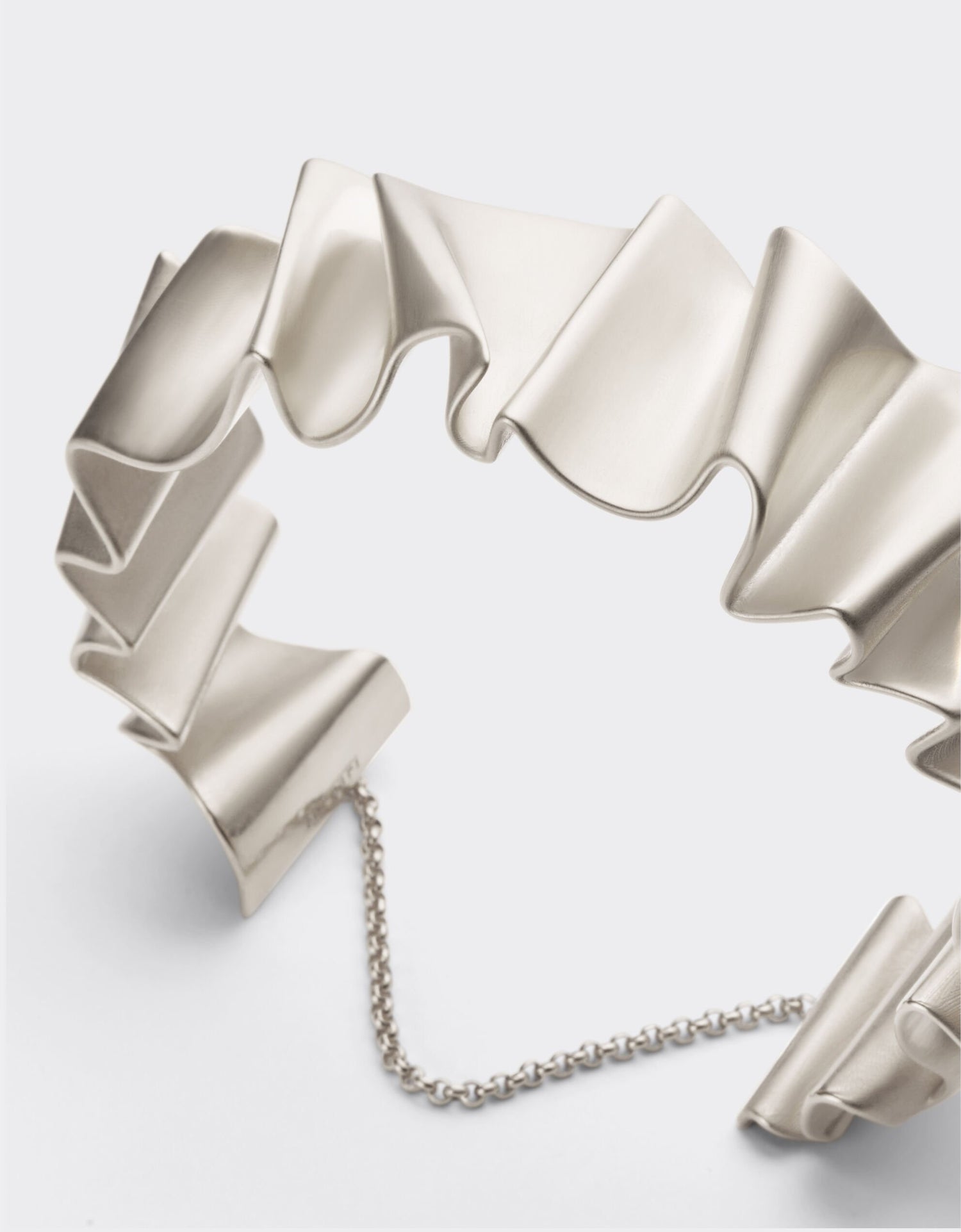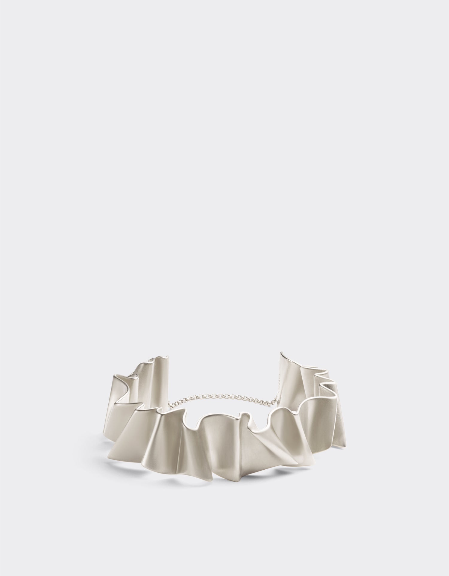 This Brass Choker by Ferrari is a striking interpretation of movement and elegance. Finished in satin palladium with an embossed motif, its sinuous lines reflect the pleated textures that inspired the collection. With bold character softened by refined Italian craftsmanship, the piece is made versatile through an adjustable chain and clasp fastening, ensuring both comfort and elevated design.