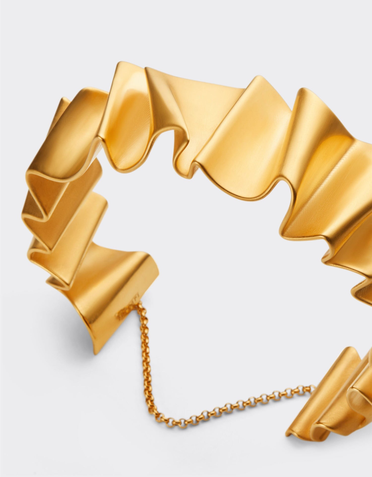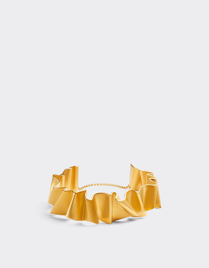 This Brass Choker by Ferrari embodies strength and fluidity in equal measure. Adorned with a satin gold finish, its embossed surface highlights the sinuous forms inspired by pleated fabric. The bold yet refined design reflects Ferrari’s dedication to sculptural elegance, while the adjustable chain ensures a comfortable and functional fit. A fusion of traditional Italian goldsmithing and modern innovation, this piece is a powerful statement of luxury.