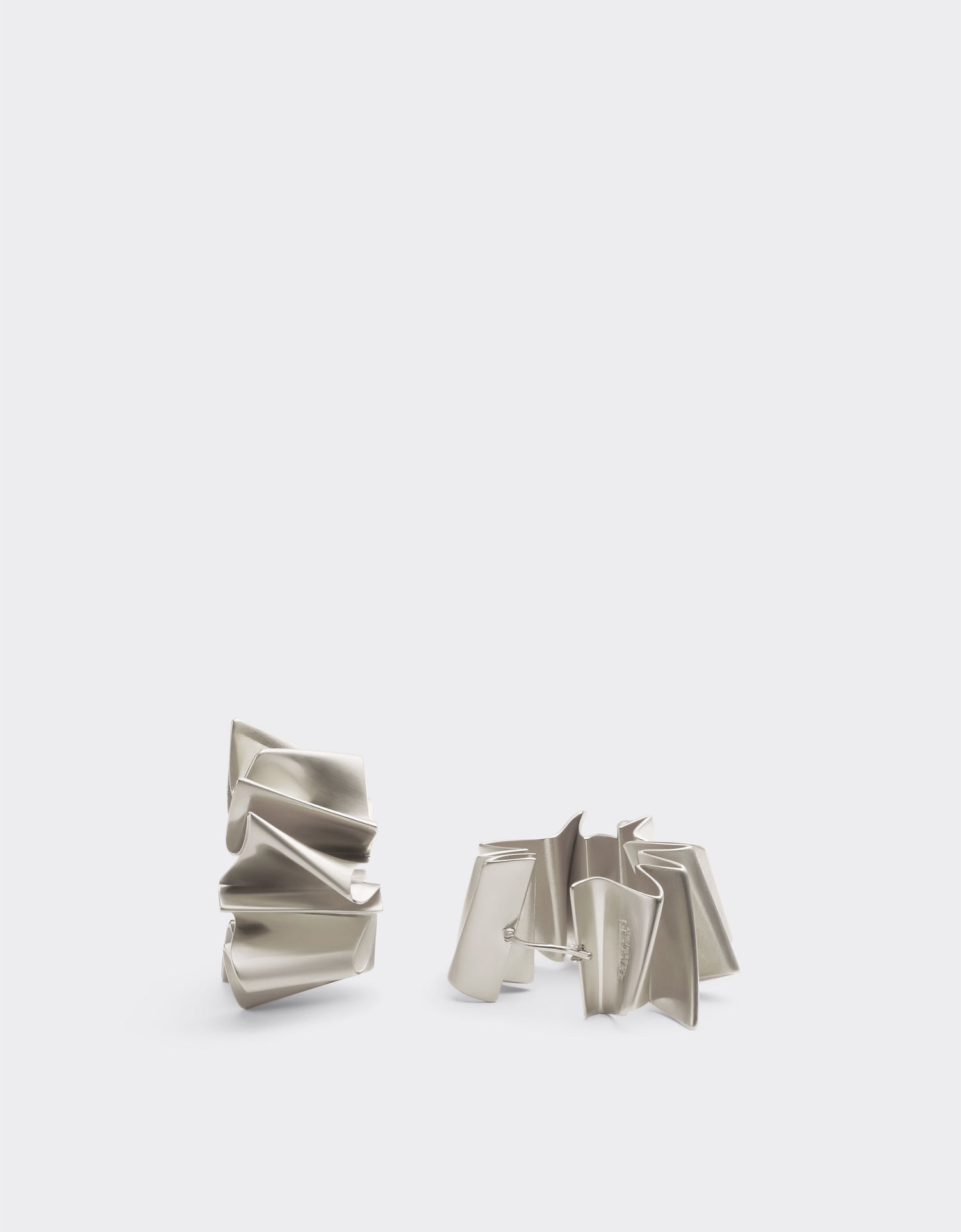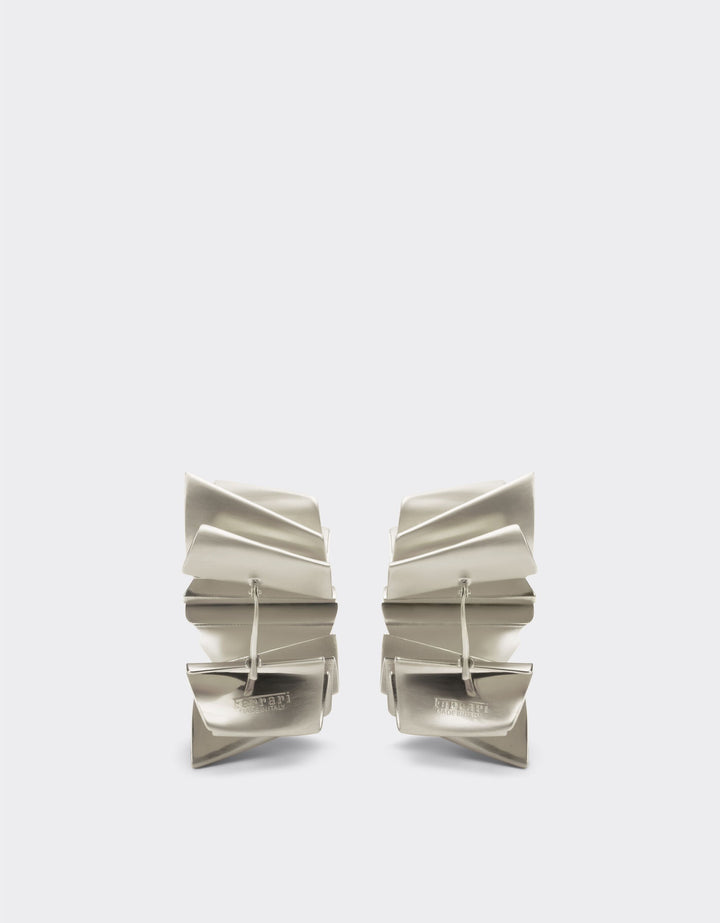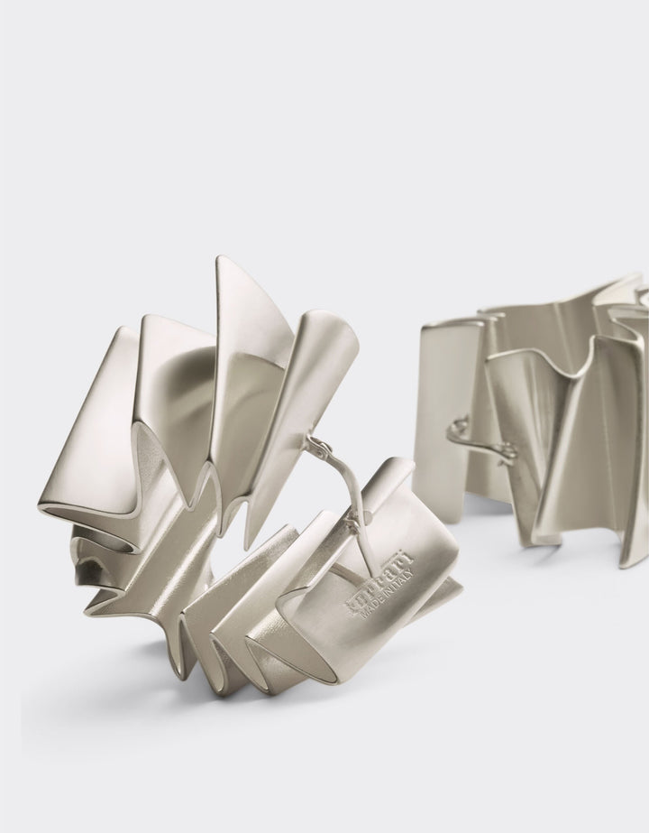 These Brass Earrings by Ferrari embody the refined balance between tradition and modernity. Finished in satin palladium with an embossed motif, their curved form reflects the dynamic essence of movement that defines the collection. Elegant and architectural, they are secured with a clasp fastening, creating a contemporary jewel that seamlessly unites bold aesthetics with fine Italian craftsmanship.