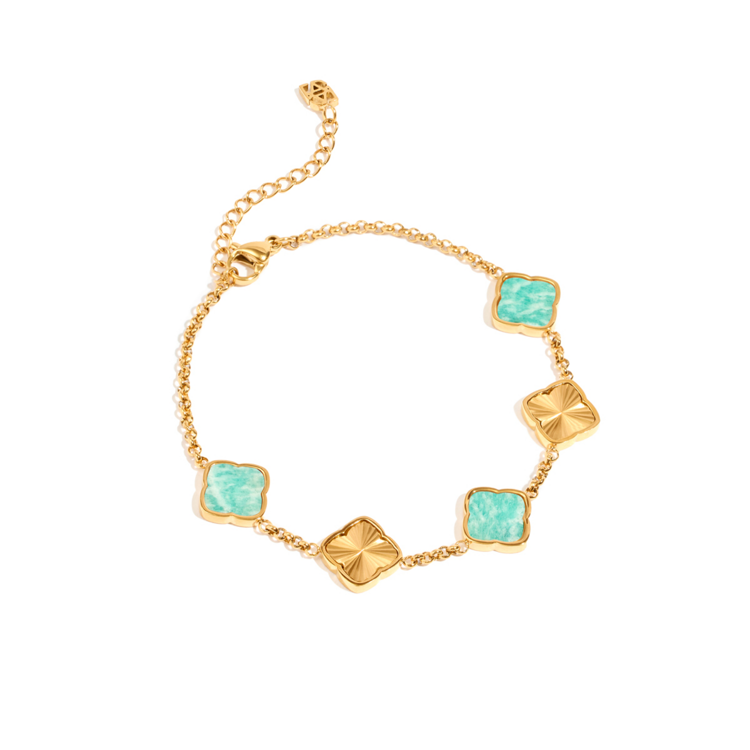 Handcrafted from 18K gold-plated stainless steel with semi-precious amazonite stones and textured clovers, this piece is available in two adjustable lengths: S/M (up to 9 inches) and M/L (up to 9.8 inches). The clover size is 12mm.