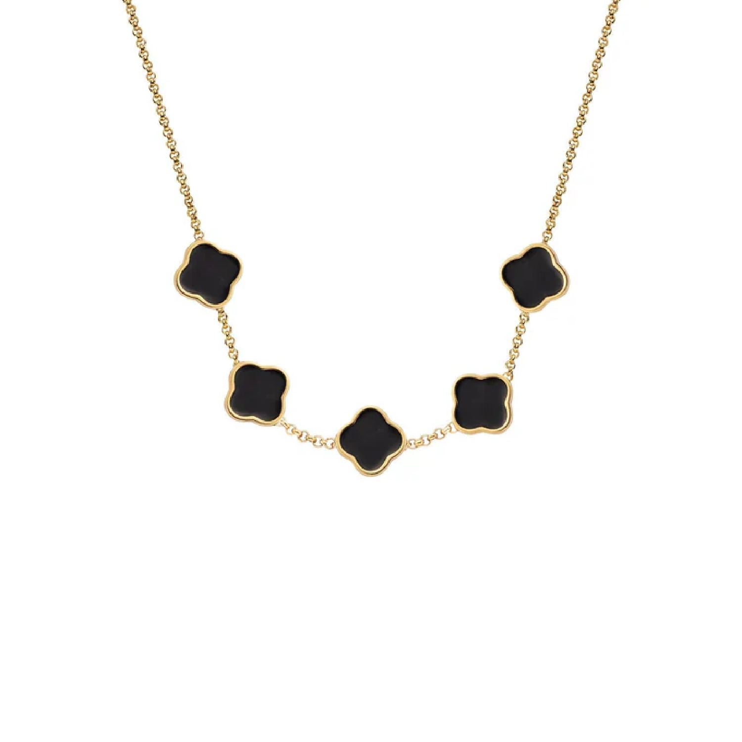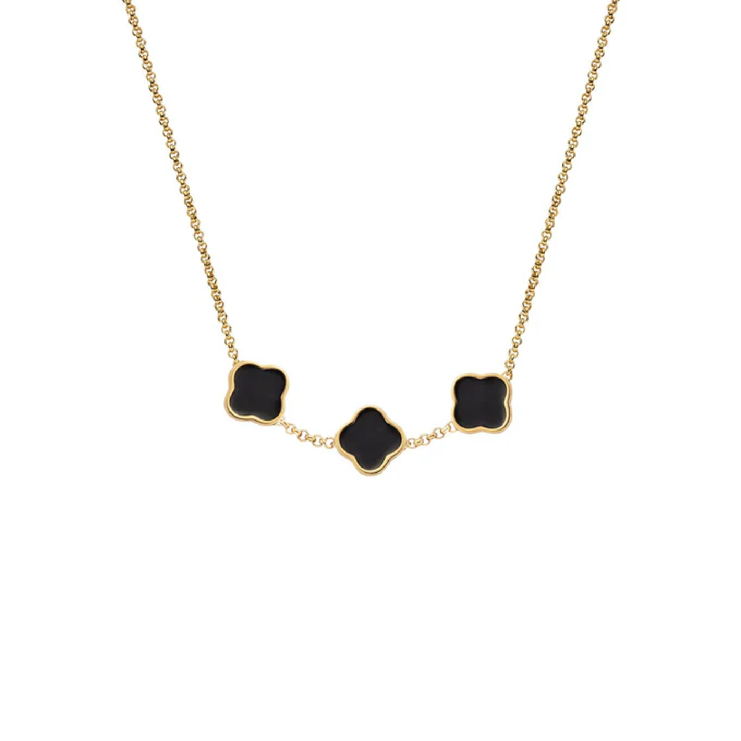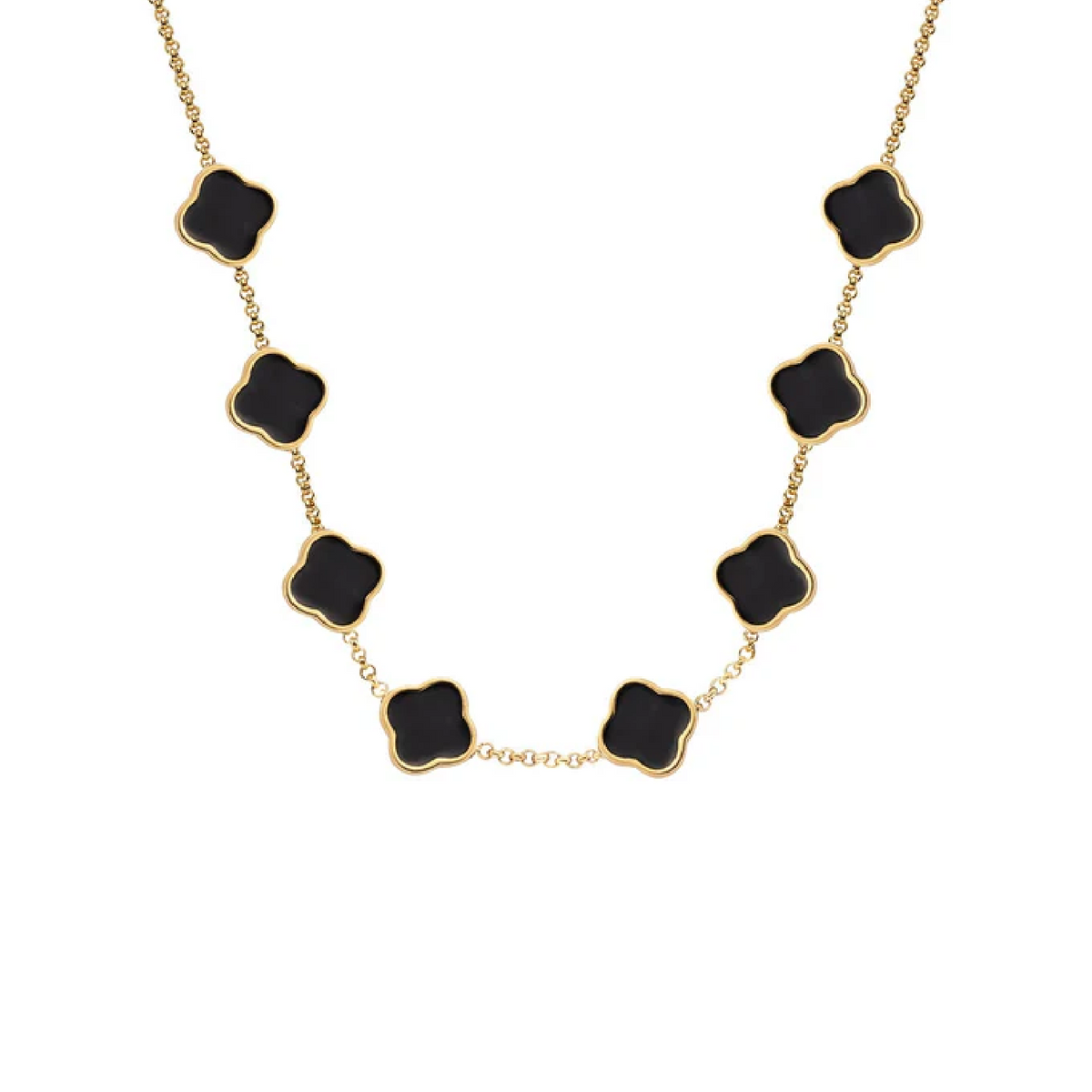 Handcrafted from 18k gold-plated stainless steel with a black enamel inlay, this necklace features a 12mm clover and a 4mm initial. It is available in three adjustable chain lengths: 14-16 inches, 16-18 inches, and 18-20 inches.