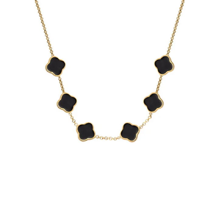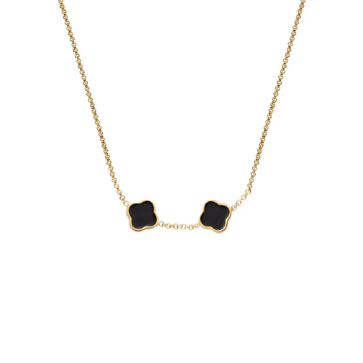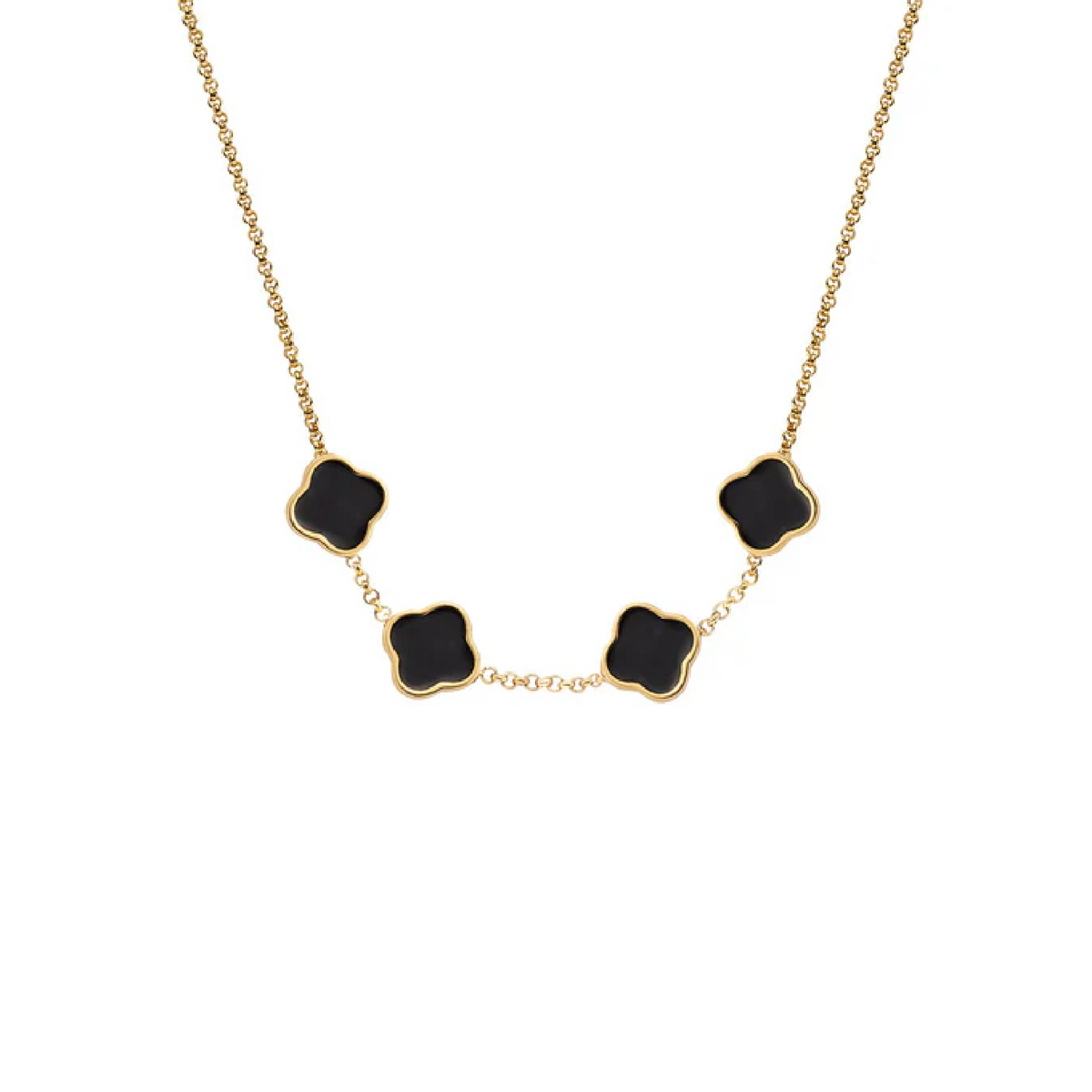 Handcrafted from 18k gold-plated stainless steel with a black enamel inlay, this necklace features a 12mm clover and a 4mm initial. It is available in three adjustable chain lengths: 14-16 inches, 16-18 inches, and 18-20 inches.