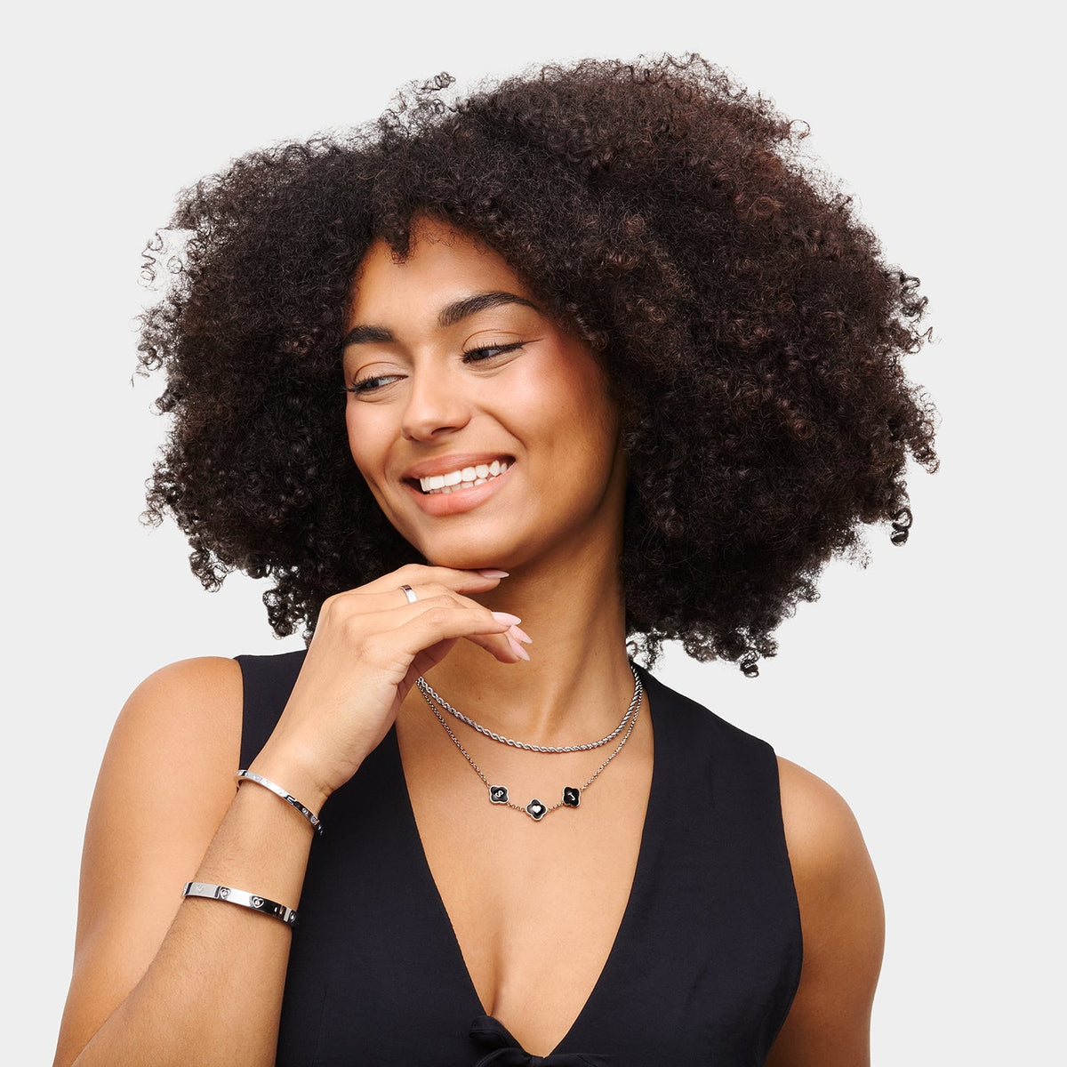 This Black Enamel Clover Custom Name Necklace by Abbott Lyon is a perfect piece for those who love a bold and personalized accessory. The striking clover pendant is finished in a high-shine black enamel, creating a sleek and modern look against the silver chain. This necklace is designed to be a unique and bespoke piece, allowing you to add initials, birthstones, or icons of your choice. It's an elegant way to express your style and celebrate a loved one or a meaningful memory.