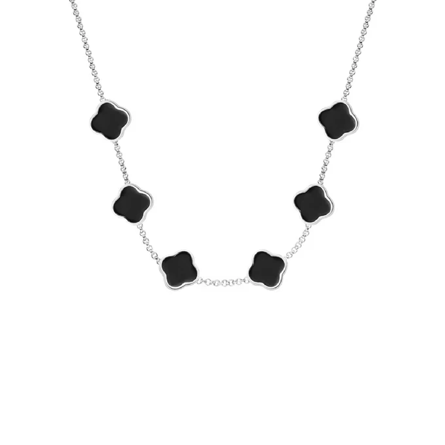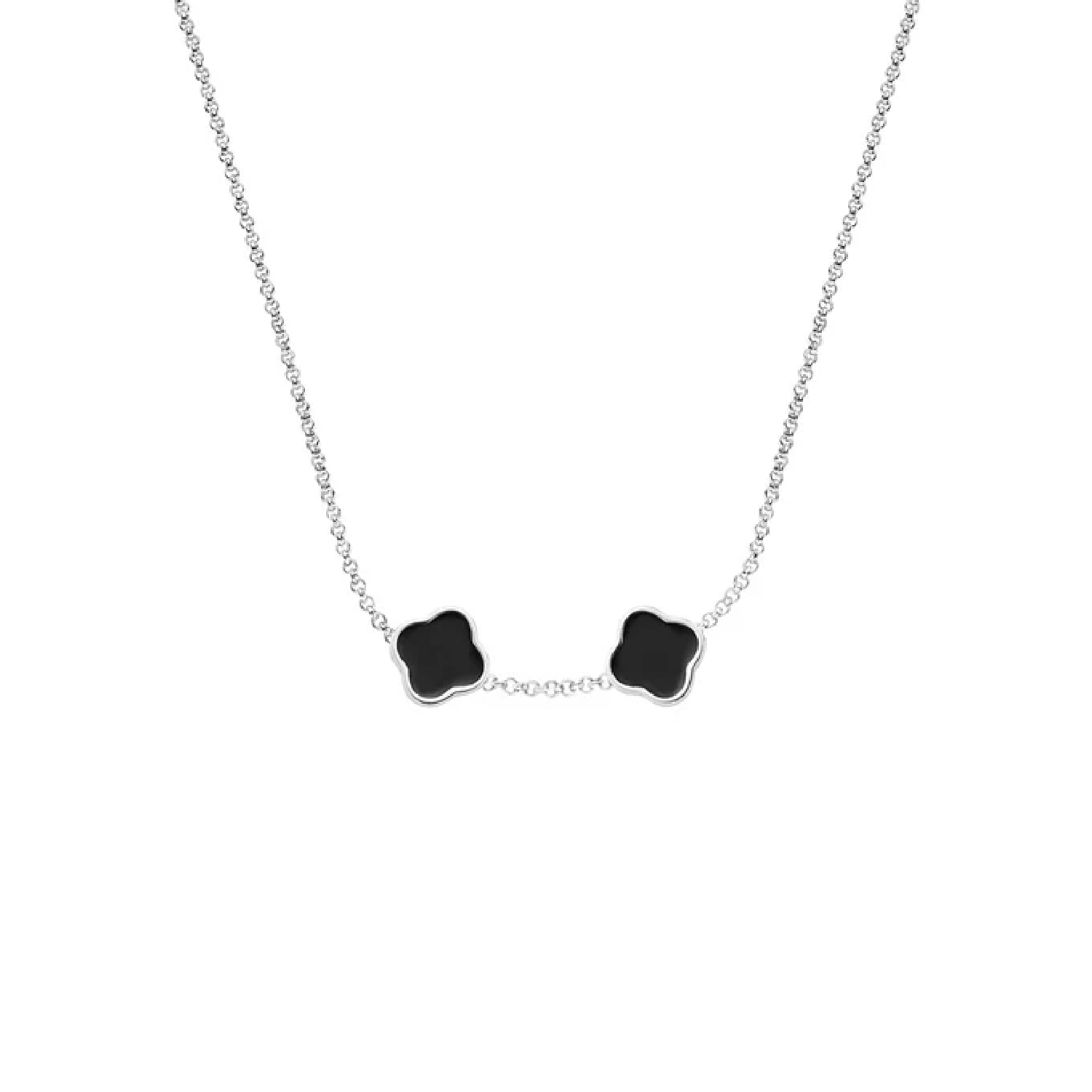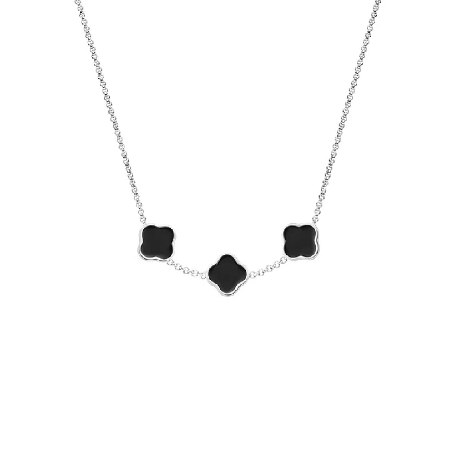 Handcrafted from polished stainless steel with a black enamel inlay, this necklace features a 12mm clover and a 4mm initial. It is available in three adjustable chain lengths: 14-16 inches, 16-18 inches, and 18-20 inches.