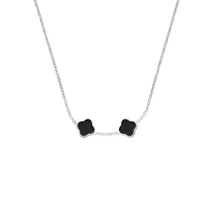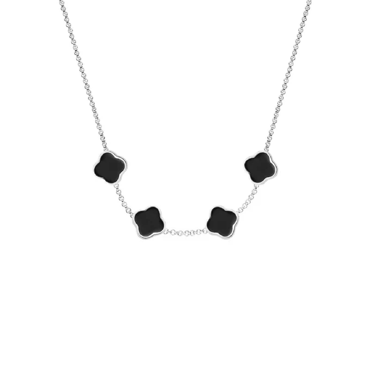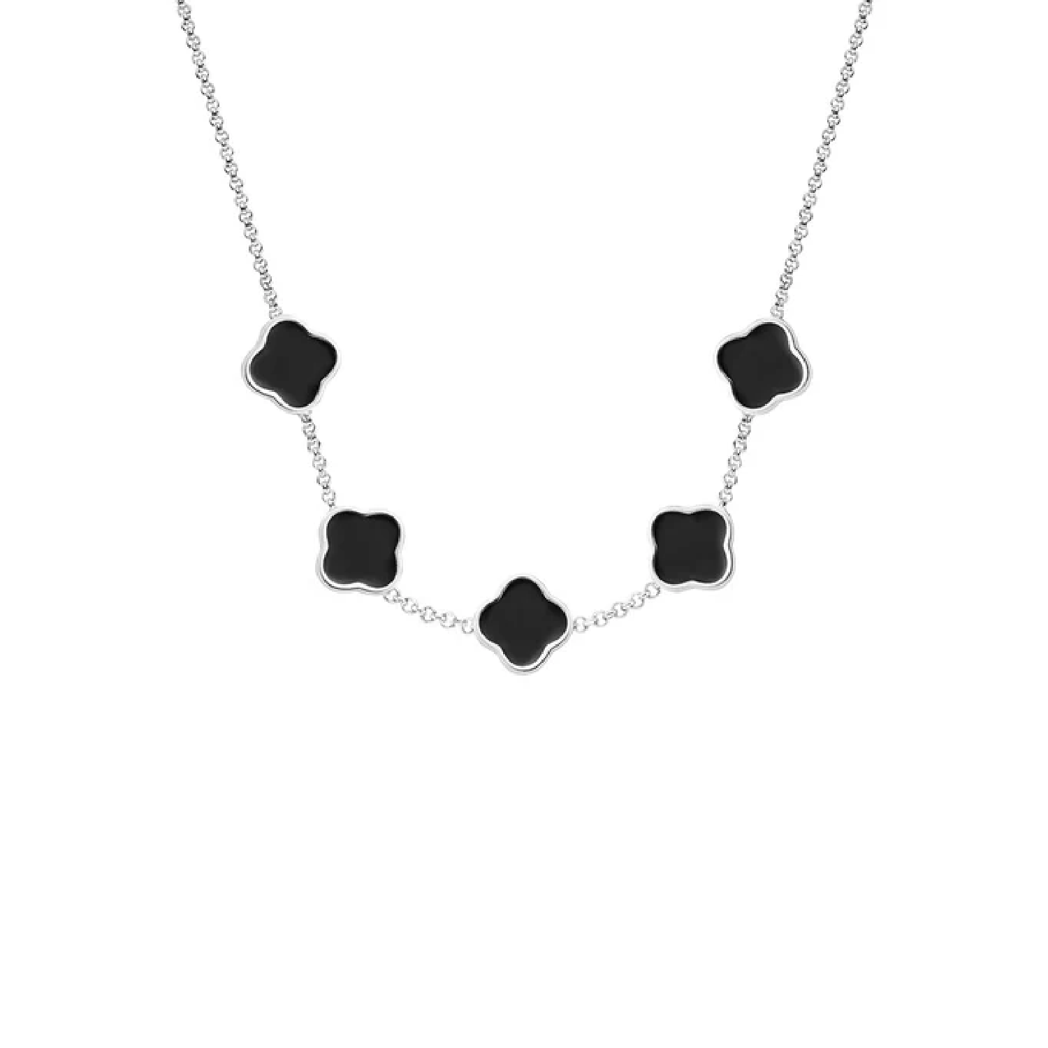 Handcrafted from polished stainless steel with a black enamel inlay, this necklace features a 12mm clover and a 4mm initial. It is available in three adjustable chain lengths: 14-16 inches, 16-18 inches, and 18-20 inches.