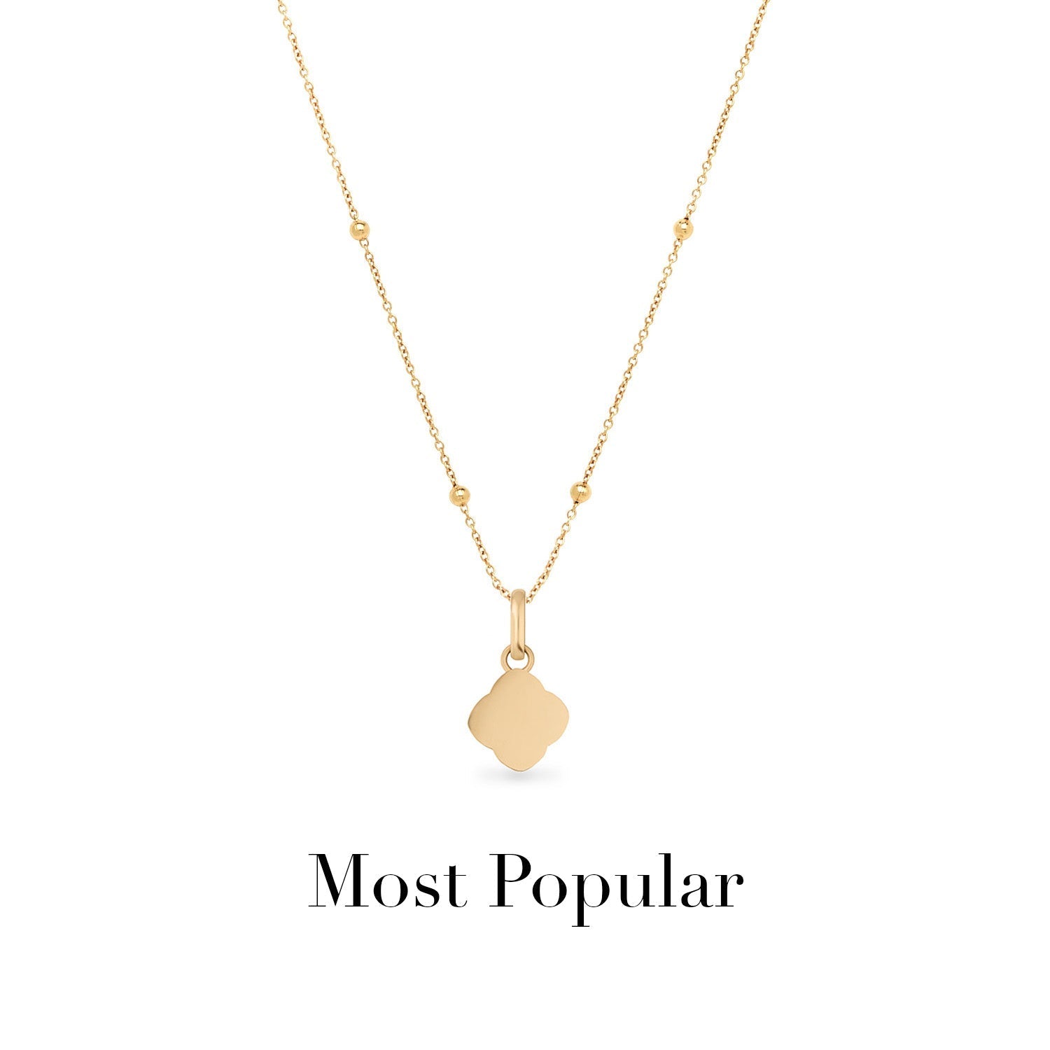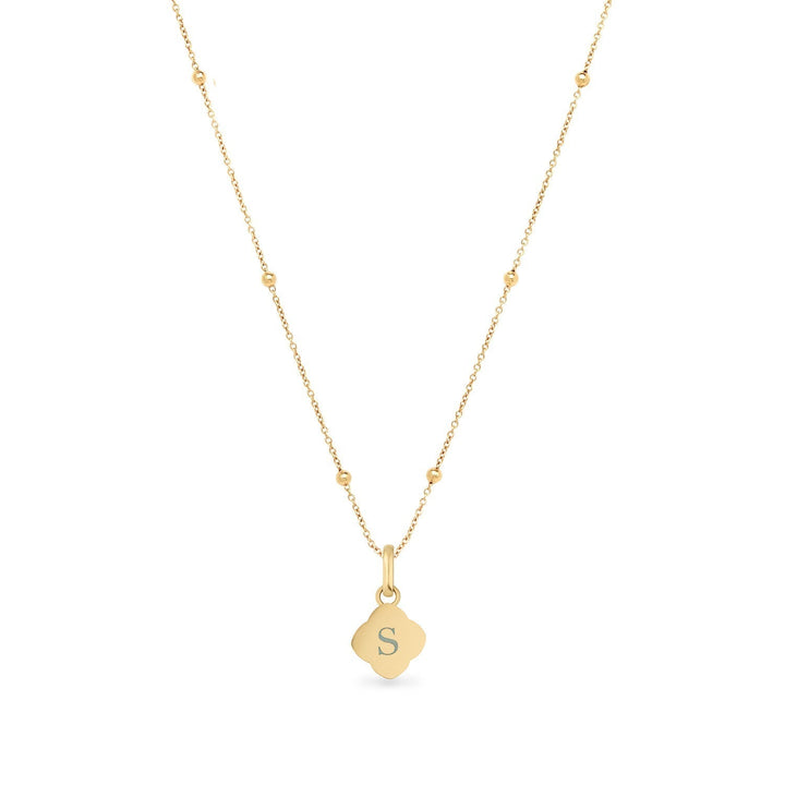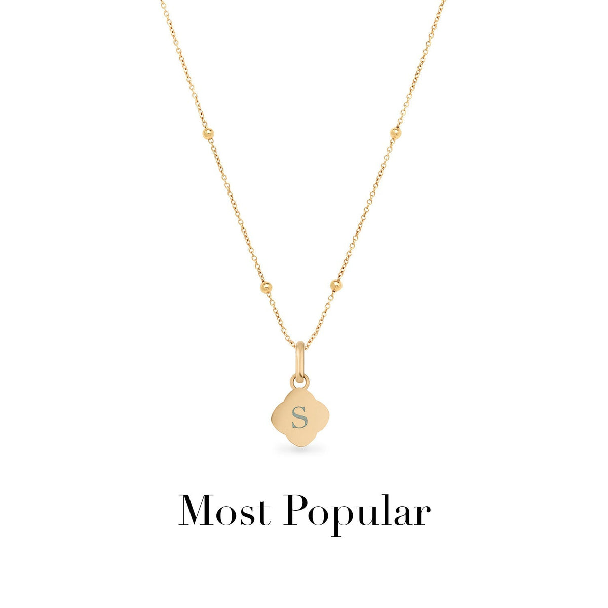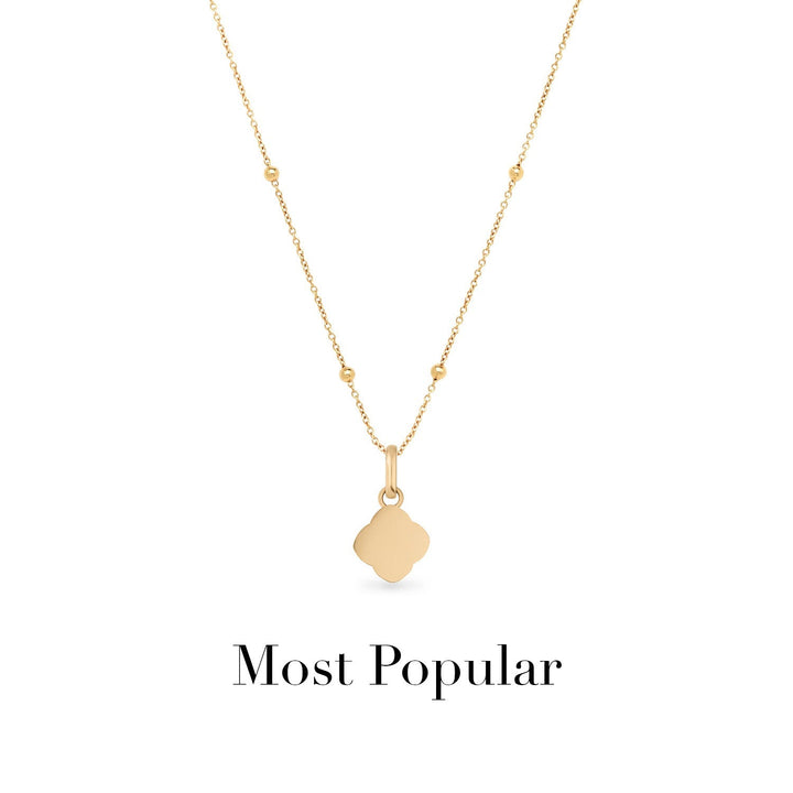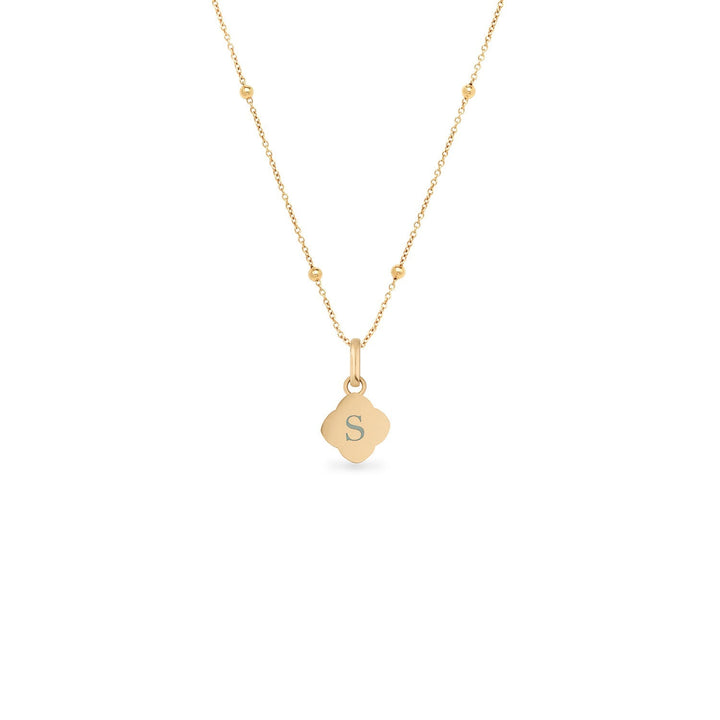 This necklace set includes an 18k gold-plated stainless steel sphere chain with a 12mm clover pendant. It can be personalized with engraving and is available in three adjustable chain lengths: 14-16 inches, 18-20 inches, and 22-24 inches.