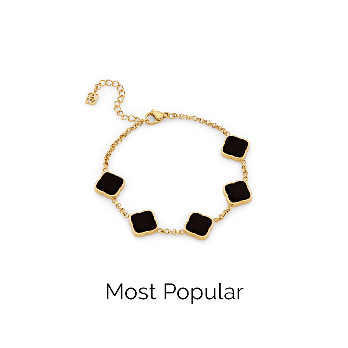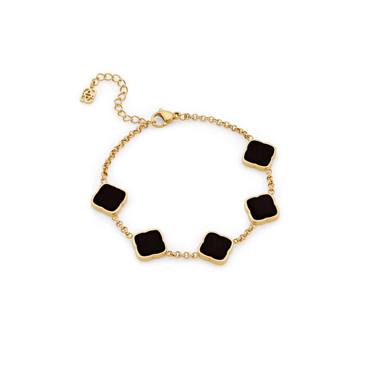 Handcrafted from 18k gold-plated stainless steel with black enamel clovers, this bracelet is available in two adjustable chain lengths: S/M (up to 9 inches) and M/L (up to 9.8 inches).