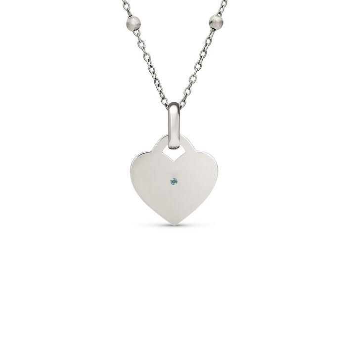 Handcrafted from platinum-plated stainless steel with cubic zirconia crystals, this necklace features a 21mm x 20mm heart pendant and can be personalized with engraving.