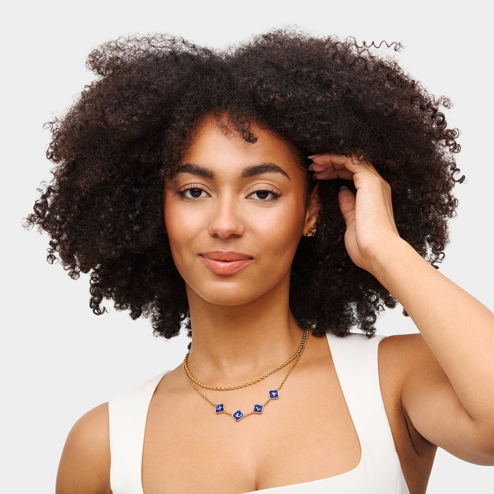 This Blue Lace Agate Clover Custom Name Necklace by Abbott Lyon is a stunning and personal accessory. The necklace features a beautiful clover pendant with a rich, dark blue lace agate stone, which is known for bringing confidence and serenity. It can be customized with your initials or name, creating a one-of-a-kind piece that holds special meaning. This necklace is perfect for stacking with other chains to create a stylish, layered look that is unique to you.