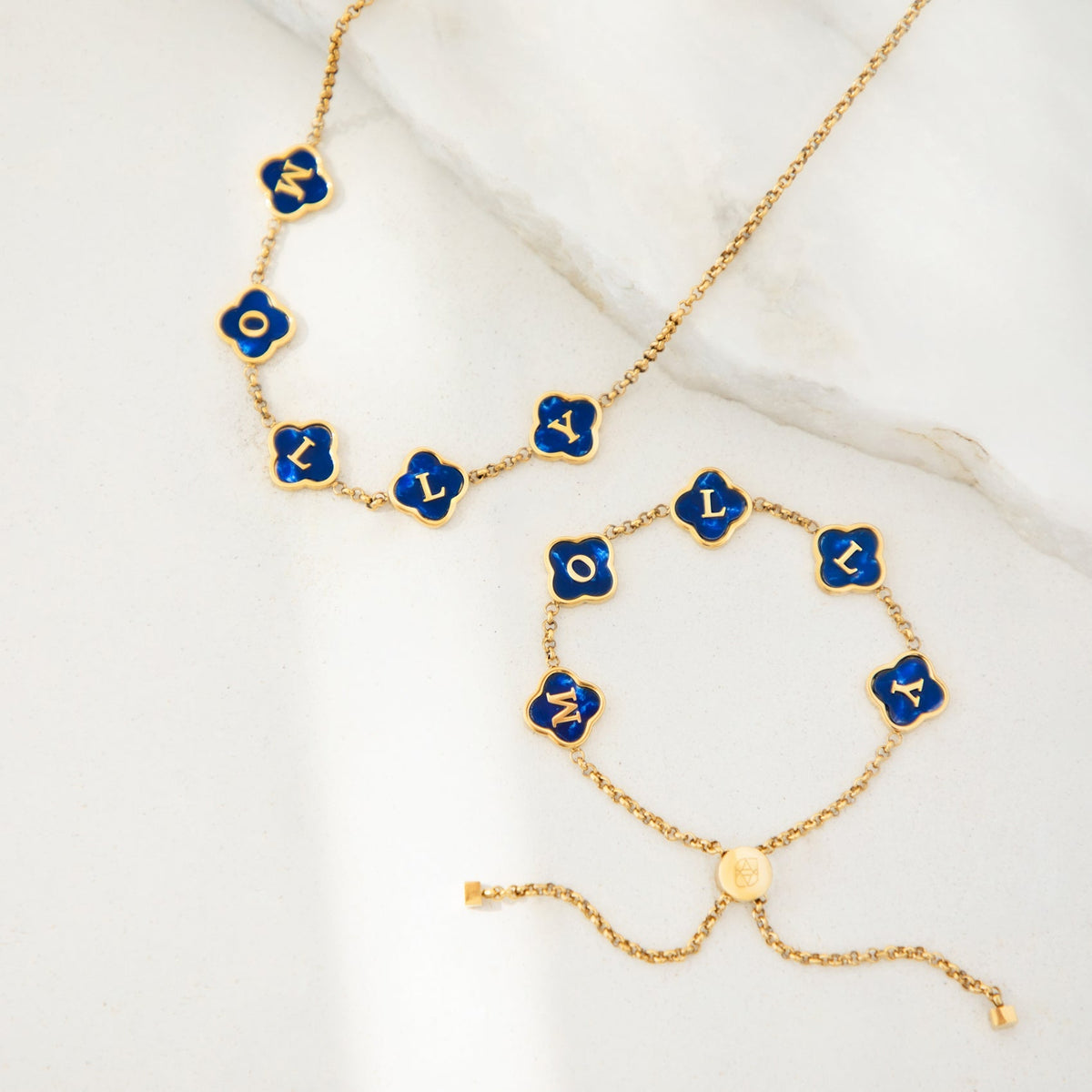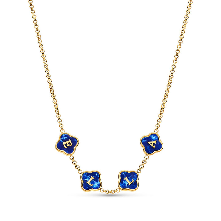 Blue Lace Agate Clover Custom Name Necklace (Gold)