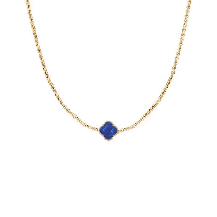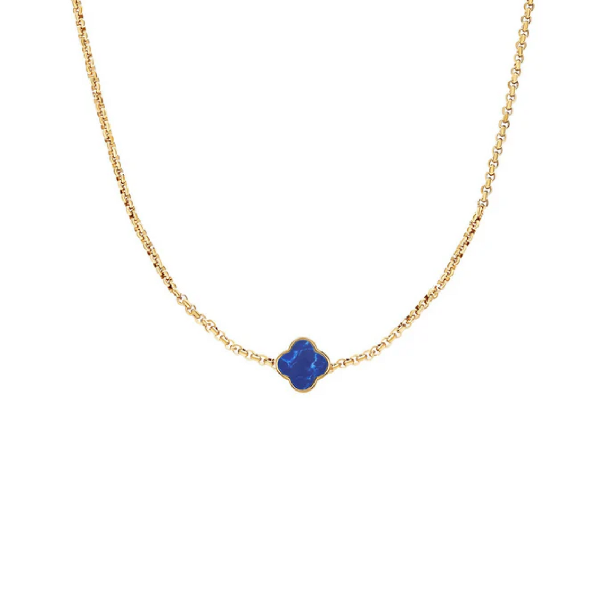 Handcrafted from 18k gold-plated stainless steel with a blue lace agate stone, this necklace features a 12mm clover and a 4mm initial. It is available in three adjustable chain lengths: 14-16 inches, 16-18 inches, and 18-20 inches.