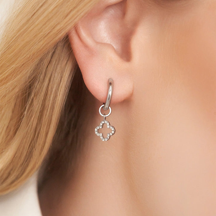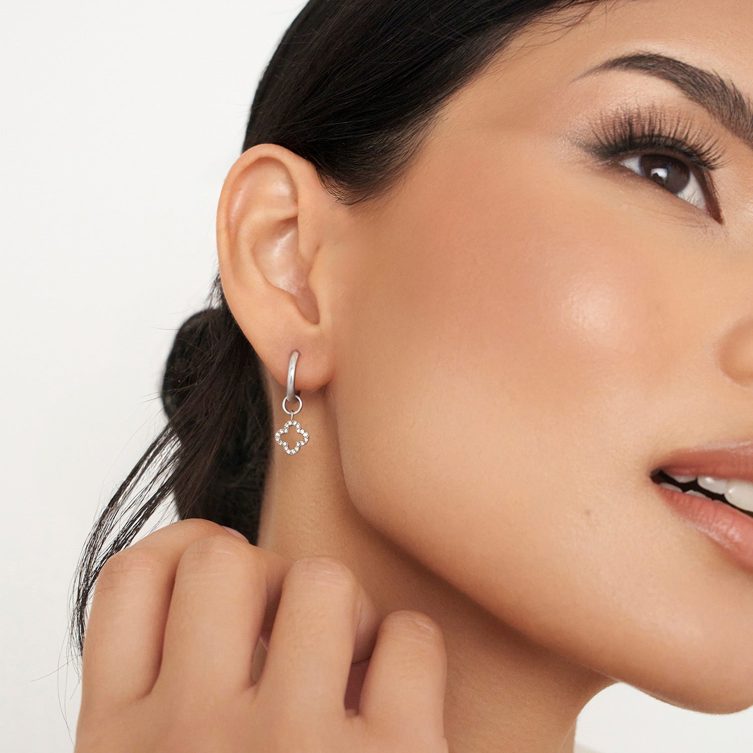 These hoops are made from silver-plated stainless steel with a clear cubic zirconia stone. The huggie hoop has an 11mm diameter and the clover pendant is 6mm.