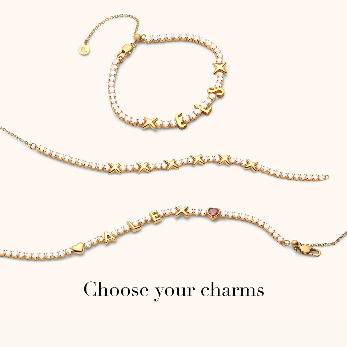 This bracelet is made from 18k gold-plated stainless steel with clear cubic zirconia. It's available in two adjustable chain lengths: S/M (6-7.5 in) and M/L (7-8.5 in). The charms measure 7-8mm.