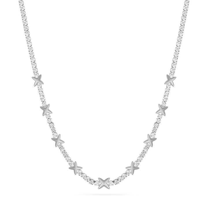This necklace is made from polished stainless steel with clear cubic zirconia. The chain is adjustable from 14 to 16 inches, and the charms measure 7-8mm.