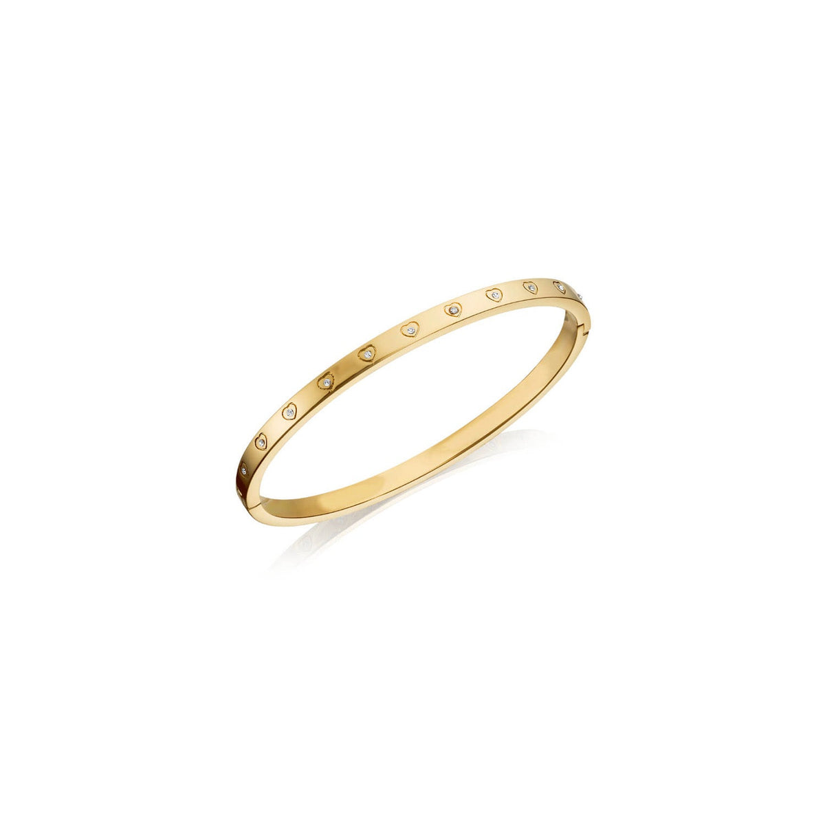 This Crystal Heart Bangle by Abbott Lyon is a classic design with a contemporary finish. The premium gold bangle features a beautiful heart detail with a touch of sparkle from clear cubic zirconia stones. This luxury bangle is a perfect accessory to elevate your everyday look and will become a timeless style staple in your collection.