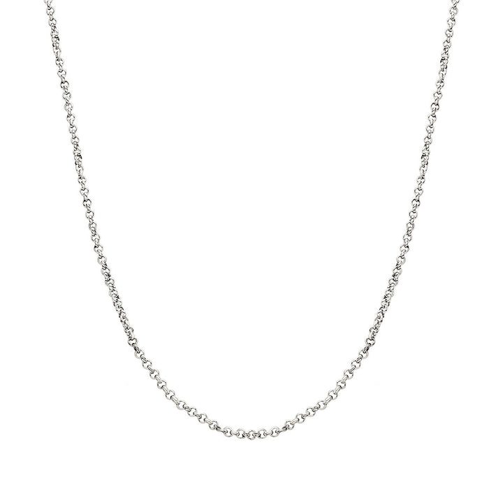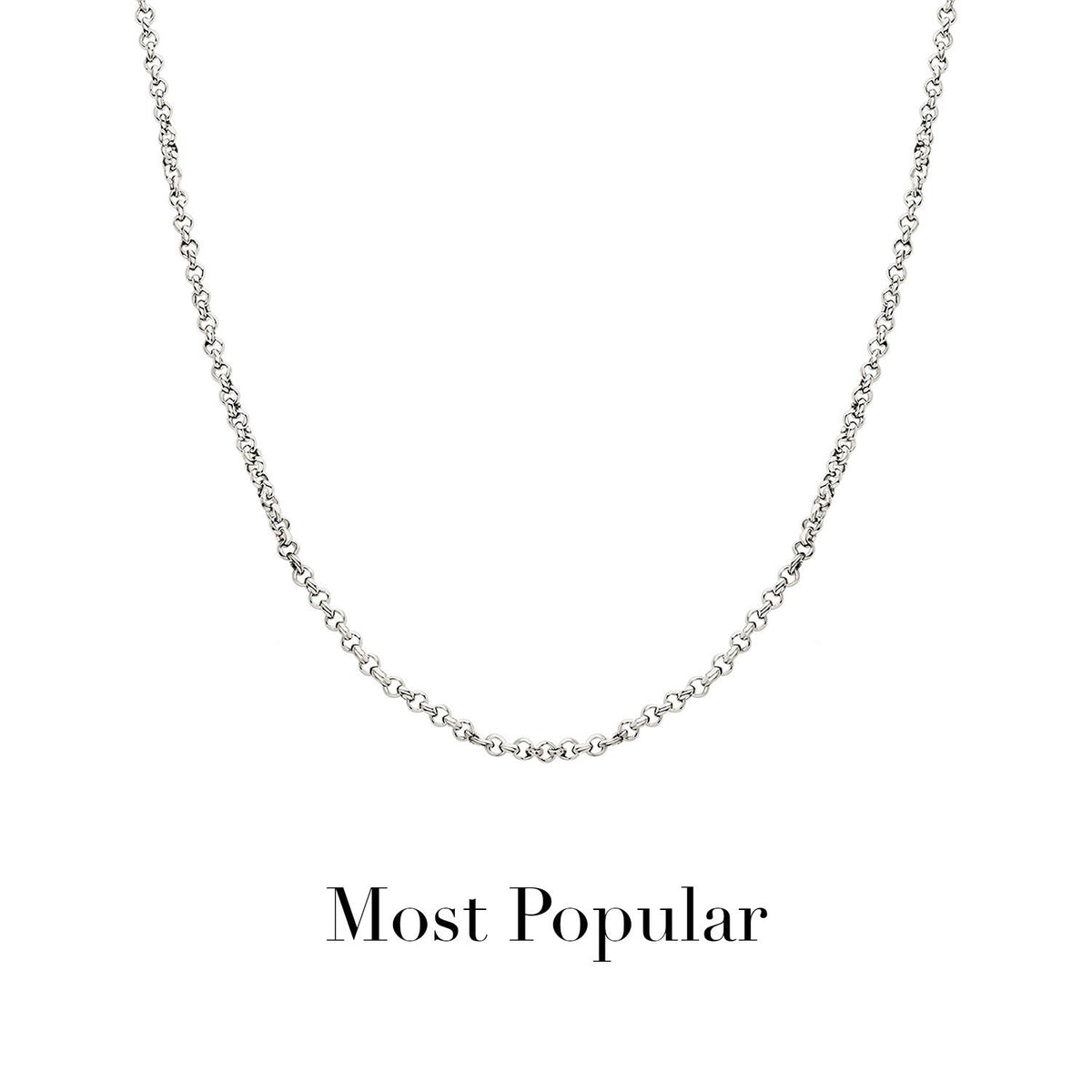 This necklace is made from polished stainless steel. It's available in three chain lengths: 14-16 in, 16-18 in, and 18-20 in. The name plate length is not included in the overall chain length.