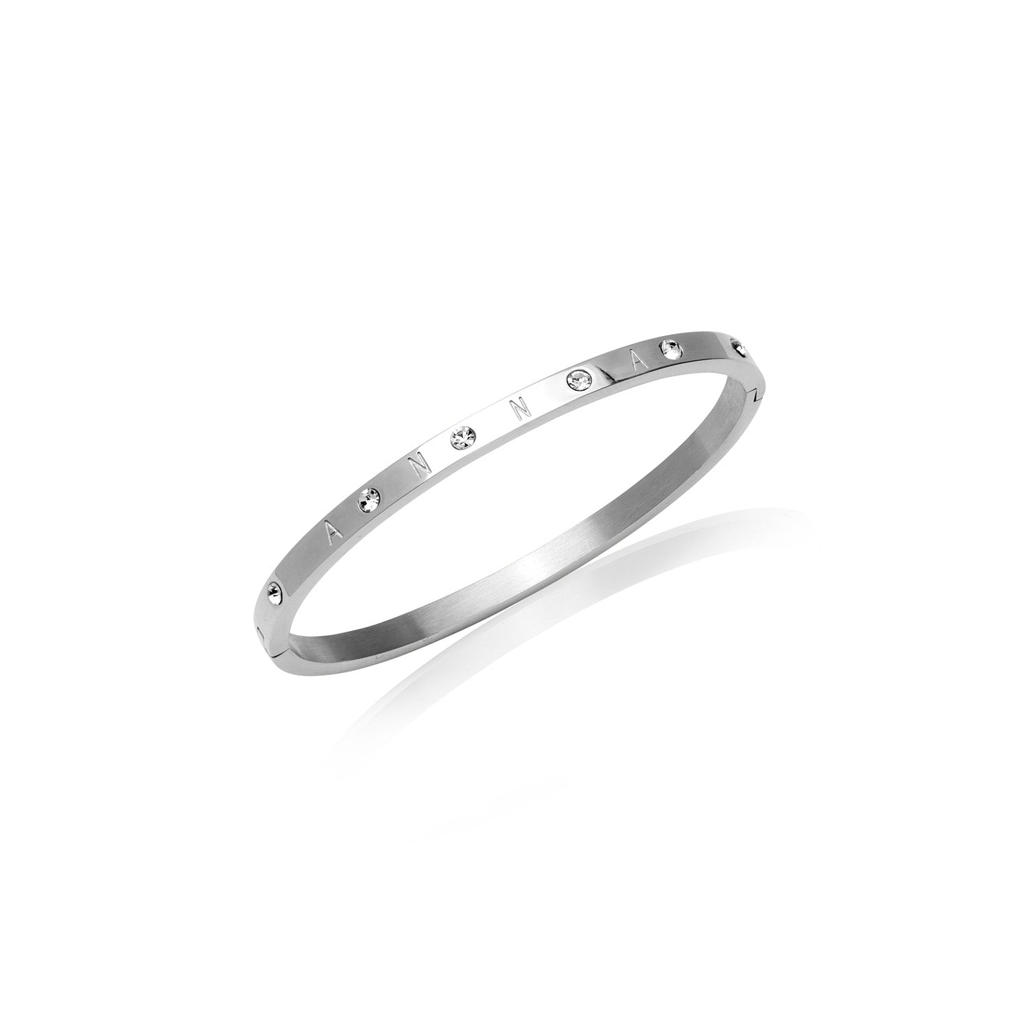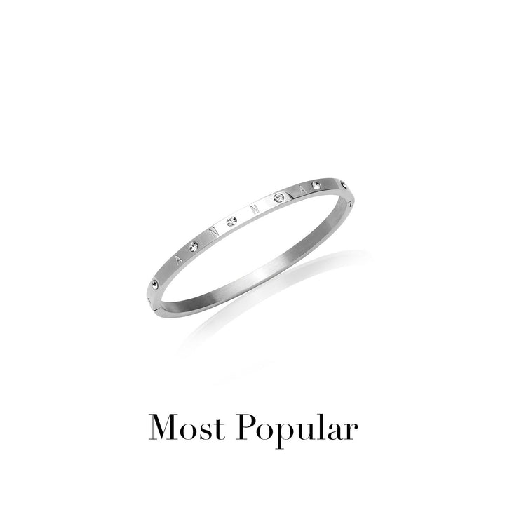 This bangle is made from silver-plated brass and clear cubic zirconia. It's available in two sizes: 165mm (S/M) and 180mm (M/L), with a width of 4mm.