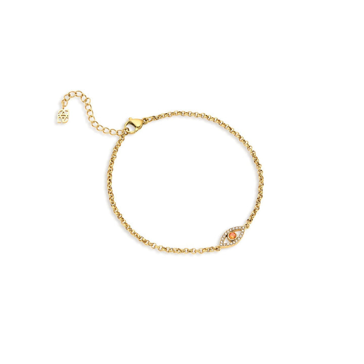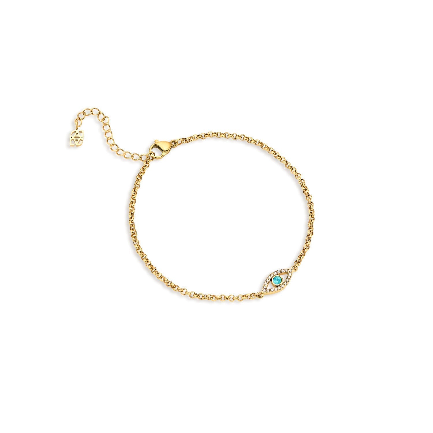 This bracelet is made from 18k gold-plated stainless steel. The evil eye measures 13mm x 6mm, and the bracelet is available in two sizes: S/M (7.5 in) and M/L (9 in).
