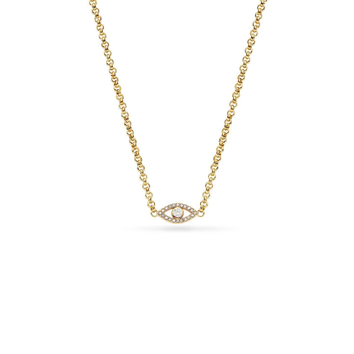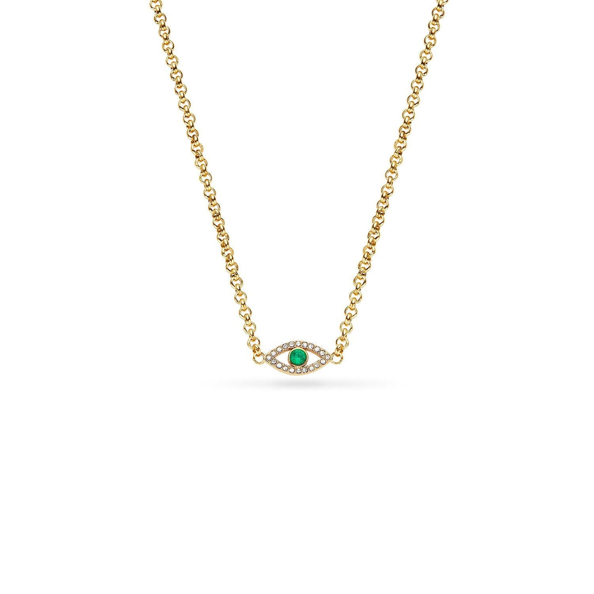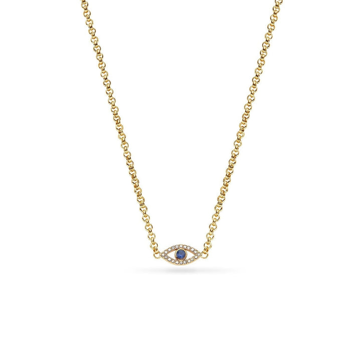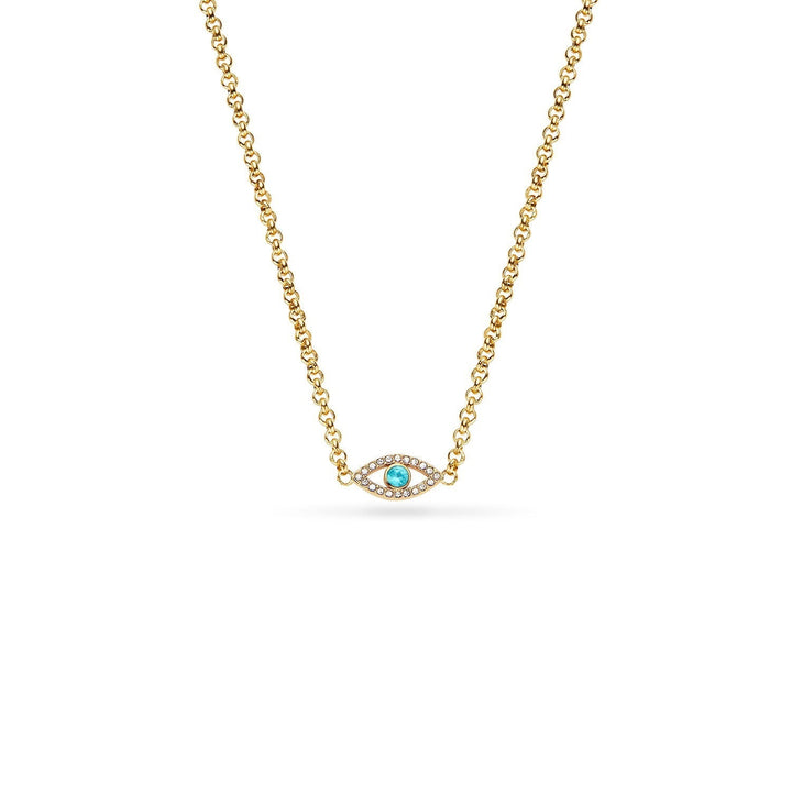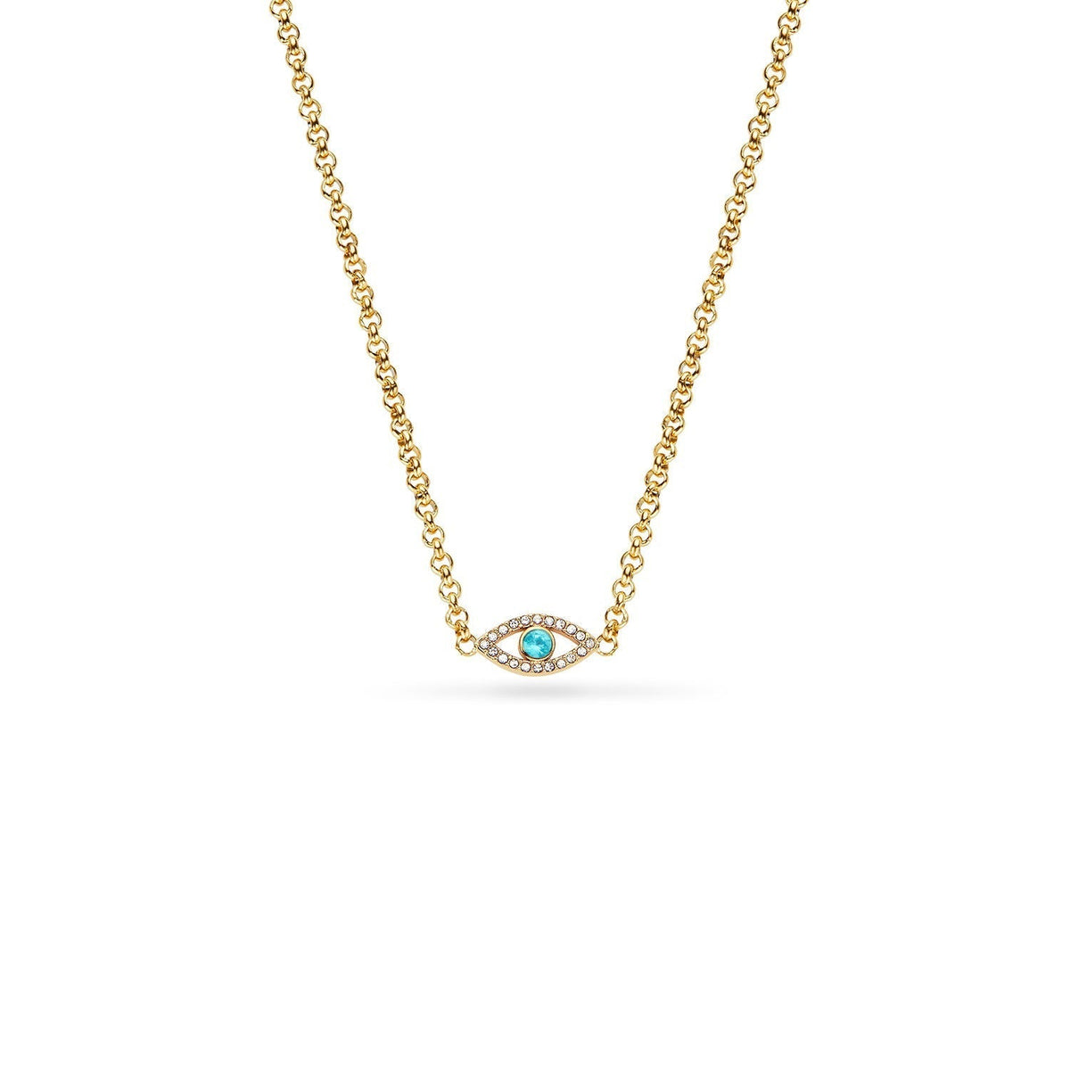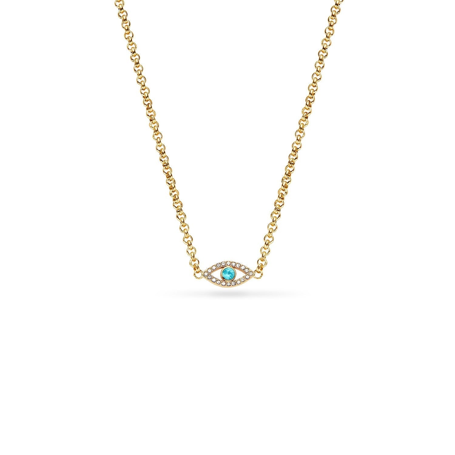 This necklace is made from 18k gold-plated stainless steel. The evil eye measures 13mm x 6mm, and the necklace is available in three chain lengths: 14-16 in, 16-18 in, and 18-20 in.