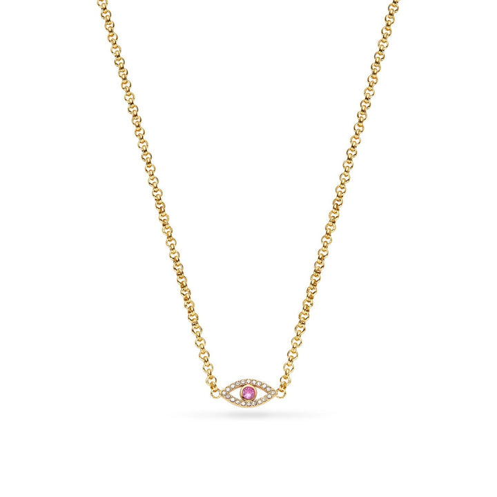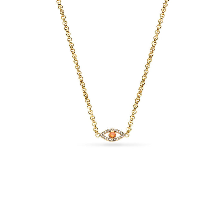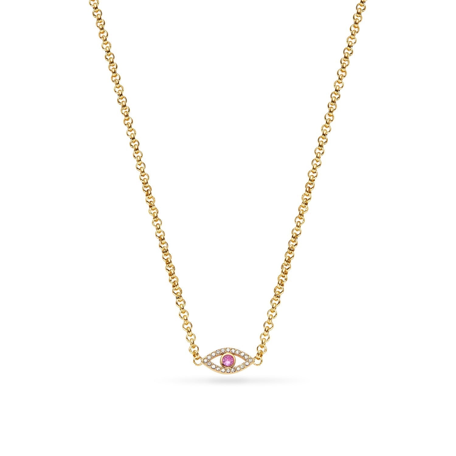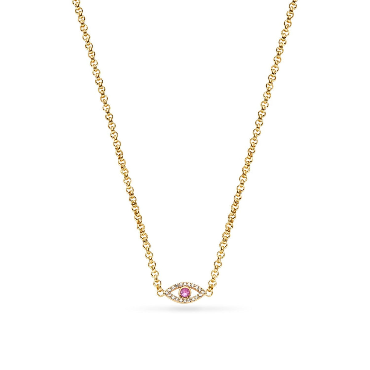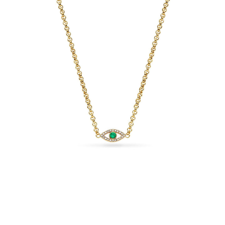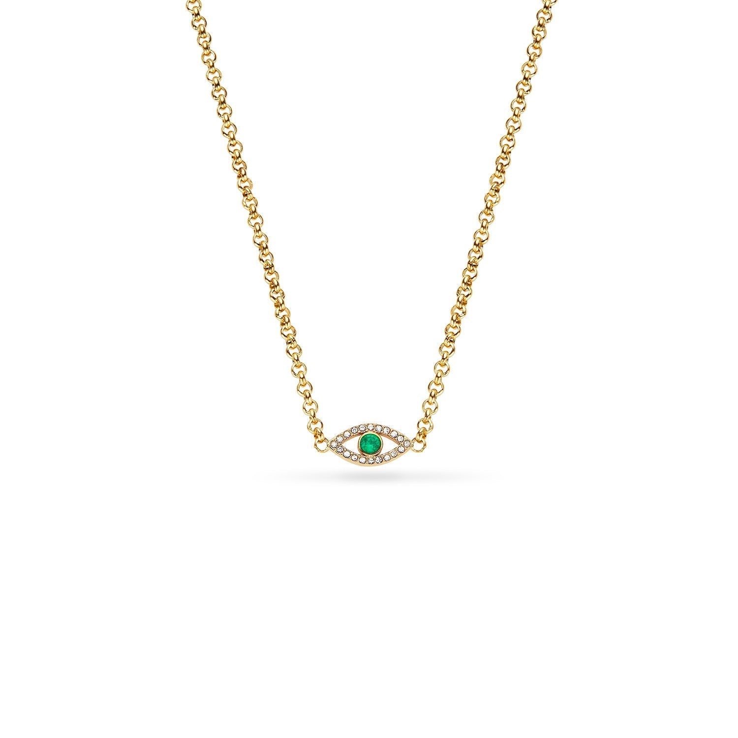 This necklace is made from 18k gold-plated stainless steel. The evil eye measures 13mm x 6mm, and the necklace is available in three chain lengths: 14-16 in, 16-18 in, and 18-20 in.