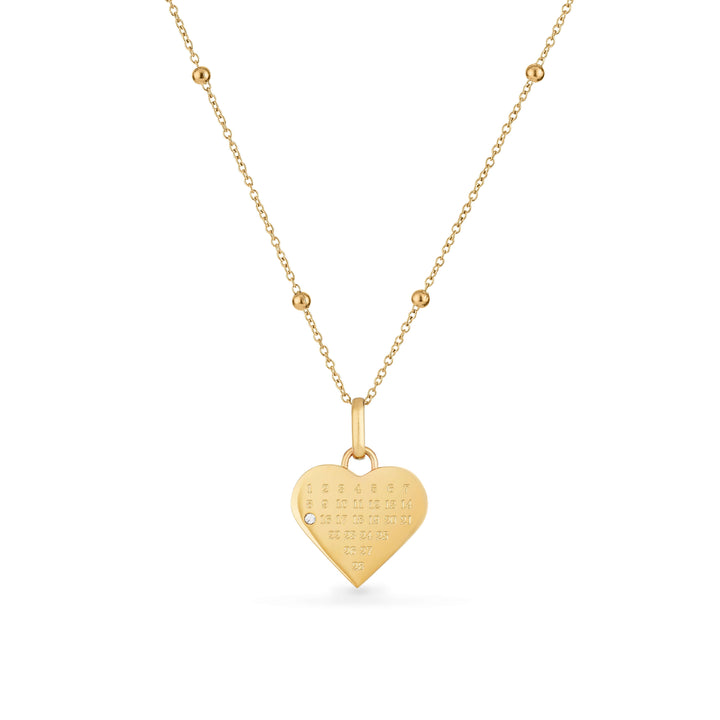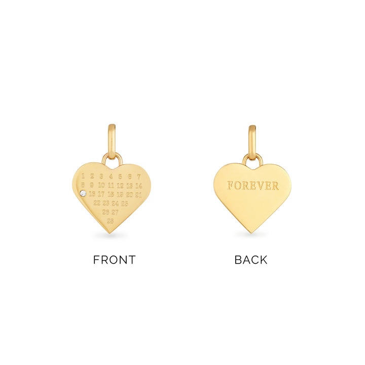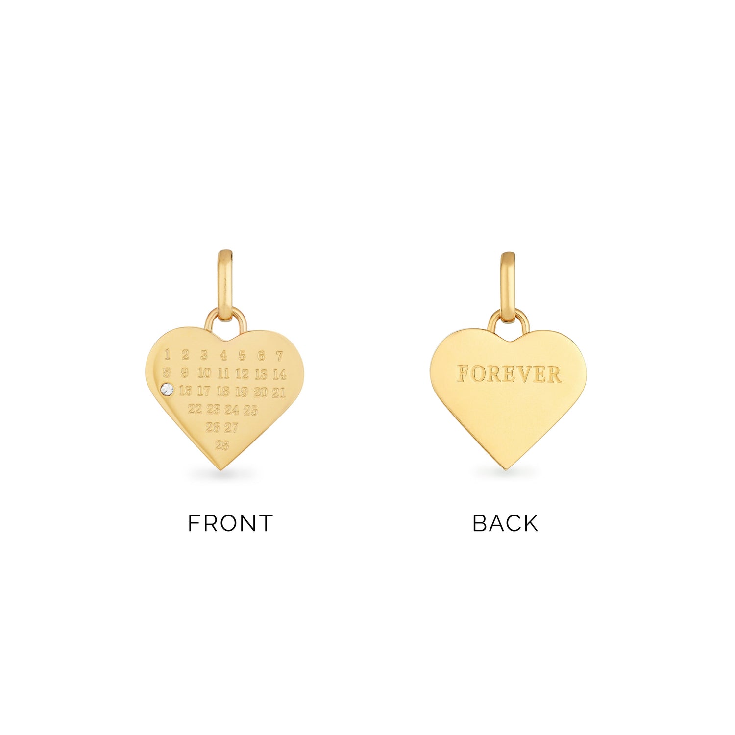 This Custom Heart Calendar Necklace by Abbott Lyon is a perfect way to commemorate an important date in your life. The necklace features a customizable heart calendar pendant with a stone to mark a specific date. The back of the pendant also has engraving potential, allowing for further personalization. It's a great piece to wear on your favorite chain.