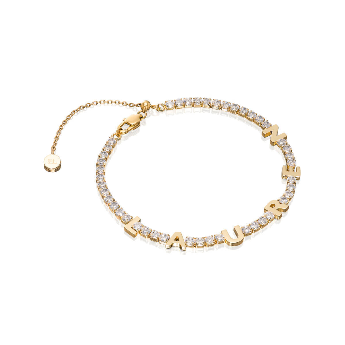 This Custom Name Tennis Bracelet by Abbott Lyon adds a touch of sparkle to your look. It's a stunning, unique piece that you can customize to create a bespoke accessory for yourself or someone special. The bracelet features brilliant cubic zirconia stones and an adjustable chain length for a perfect fit.