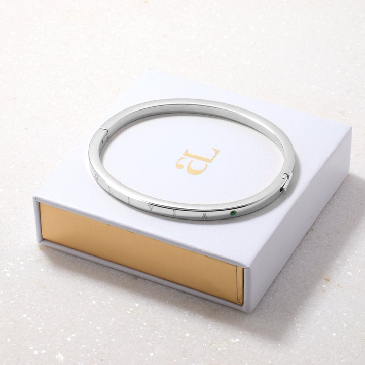 This bangle is made from silver-plated brass. It's available in two sizes: 165mm (S/M) and 180mm (M/L), and has a width of 4mm.