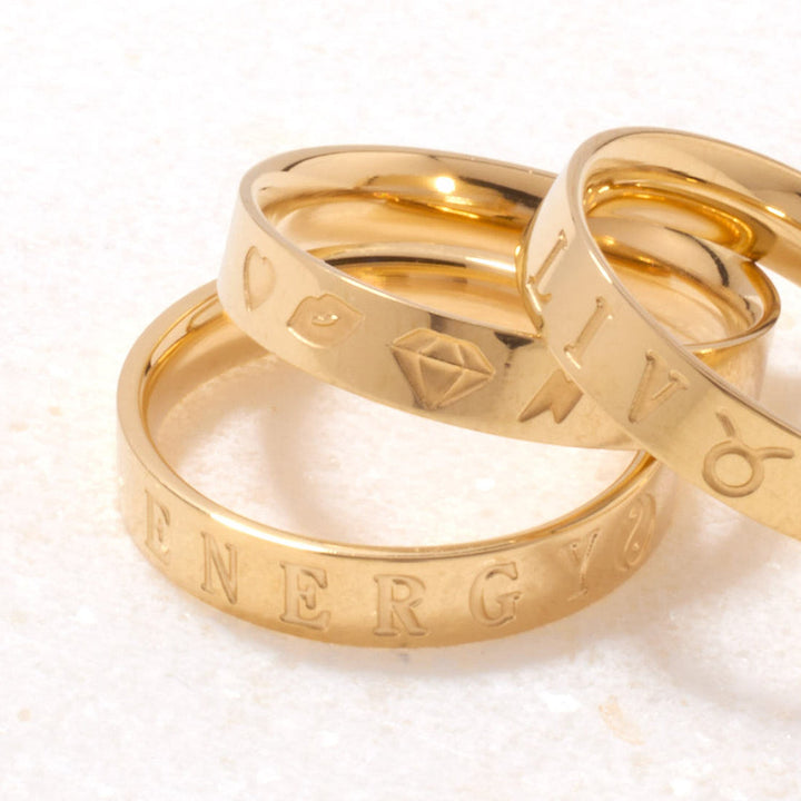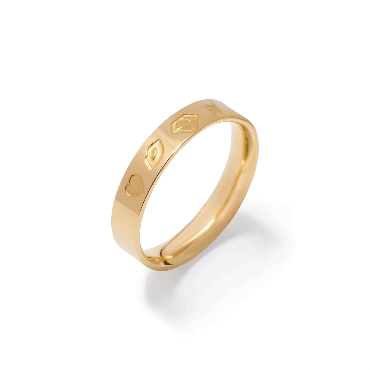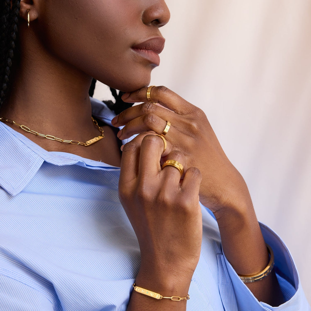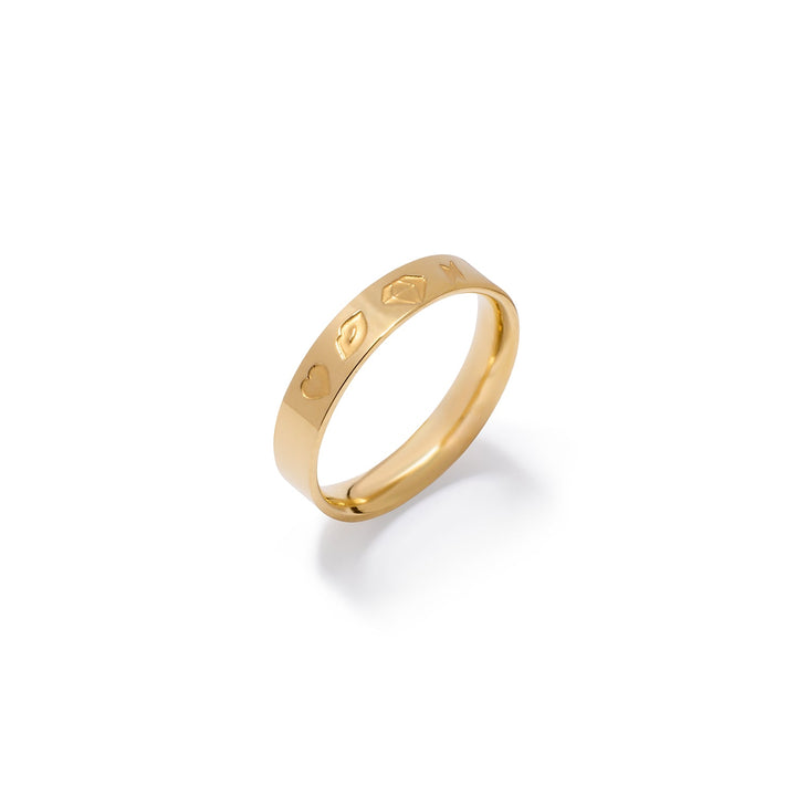 Crafted from 18k gold-plated brass, this ring features an innovative anti-tarnish protective coating, is nickel-free, and is made from over sixty percent recycled materials. It is available in three sizes with a band height of 4mm.