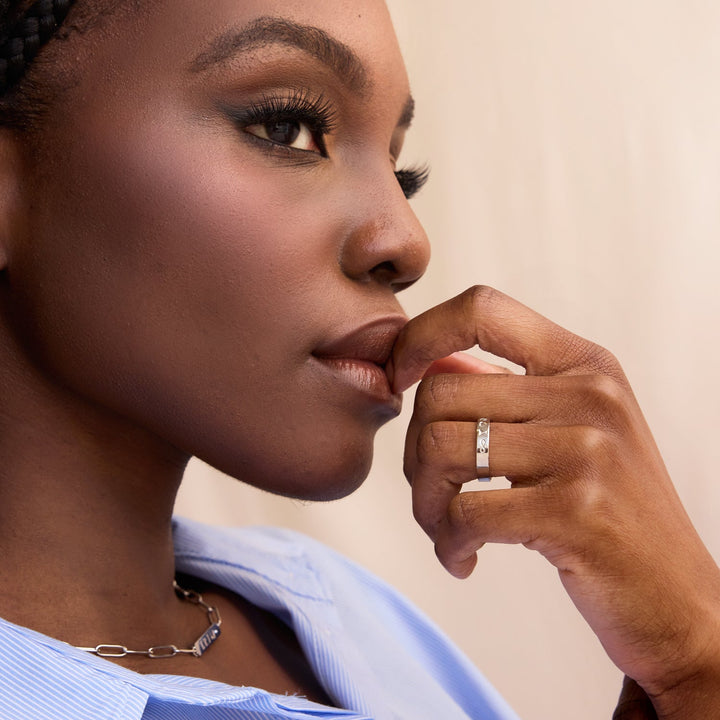 Crafted from silver-plated brass, this ring features an innovative anti-tarnish protective coating, is nickel-free, and is made from over 60% recycled materials. It is available in three sizes with a band height of 4mm.