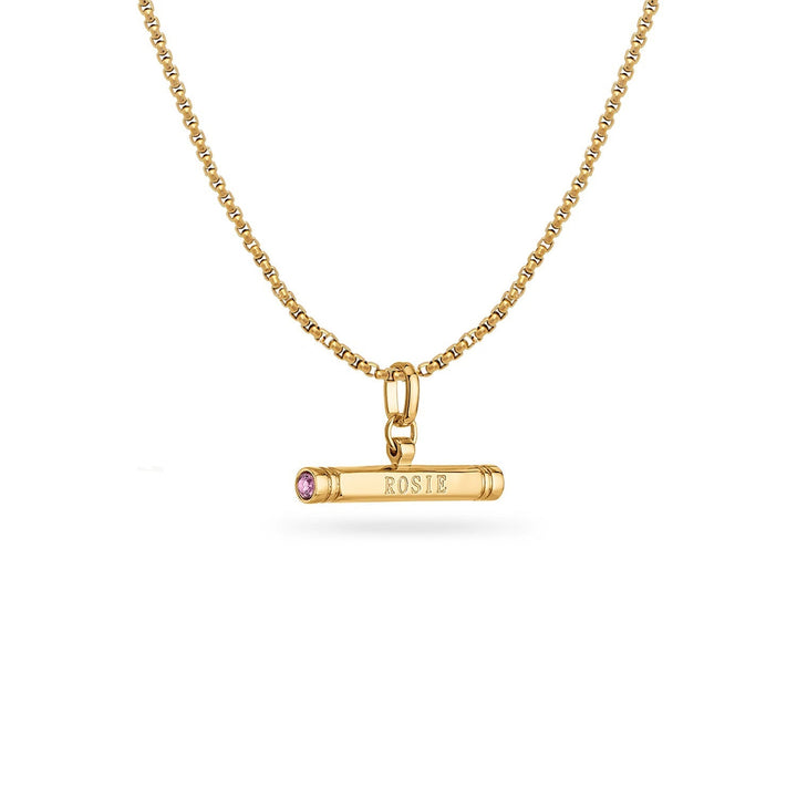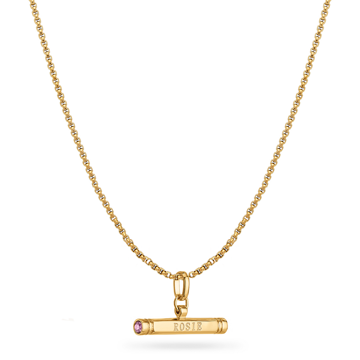 This necklace is crafted from 18k gold-plated stainless steel with a 31mm T-Bar pendant and a 3.5mm cubic zirconia accent. It is water, sweat, and heat-resistant, made from over 60% recycled materials, and is available in three chain lengths (14-16 in, 16-18 in, and 18-20 in) with four chain options: Fine, Sphere, Box, and Small Figaro.