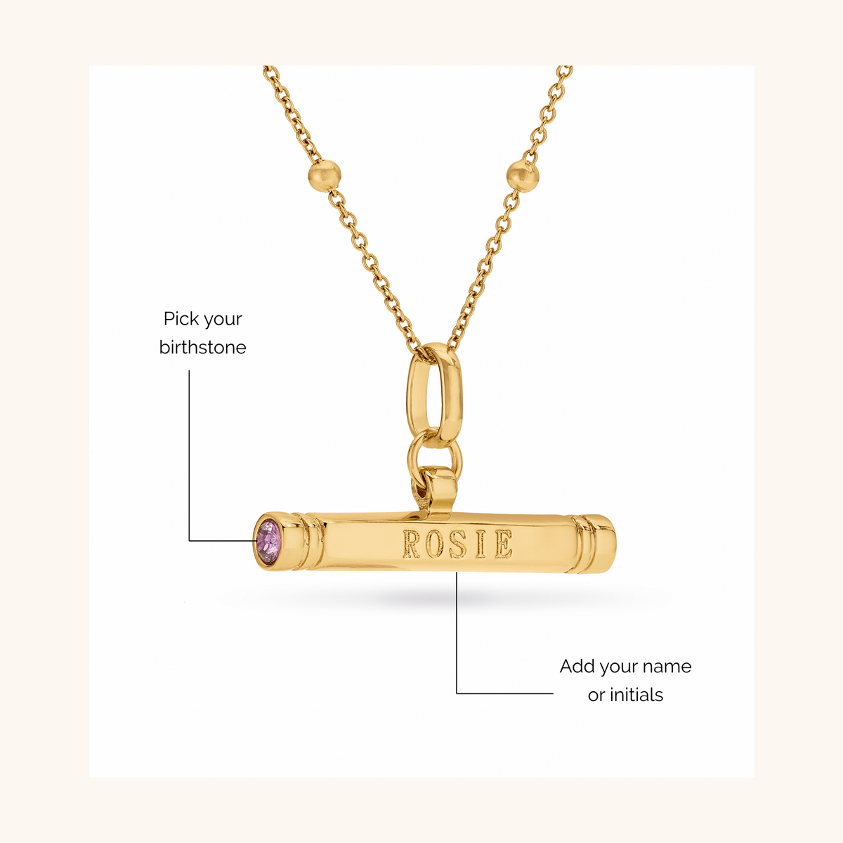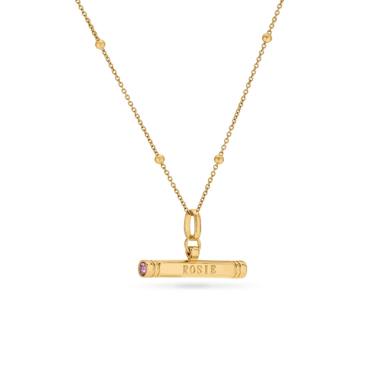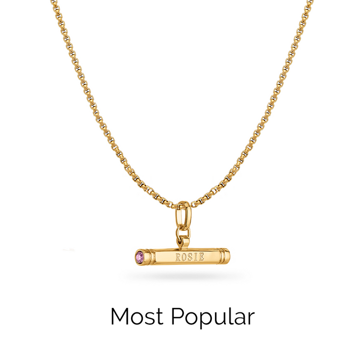 This Custom Stamped T-Bar Necklace by Abbott Lyon is the perfect customizable pendant. Stamp it with up to nine characters, whether it's a name, a date, or a word that inspires you. The minimalist T-Bar design provides a sleek and modern canvas for your unique message. You can further tailor this piece by selecting one of four best-selling gold chains to complement your style. This necklace is an ideal gift for a loved one or a special piece to keep for yourself, perfect for layering with other pendants to create a truly personalized look.