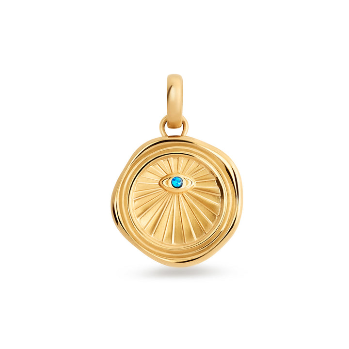 This necklace is crafted from 18k gold-plated stainless steel with an 18mm x 18mm coin pendant and features a Preciosa semi-precious stone. It is water, sweat, and heat-proof and made from over 60% recycled materials. Personalization options include a talisman symbol, initial, engraved phrase, and choice of chain style and length.